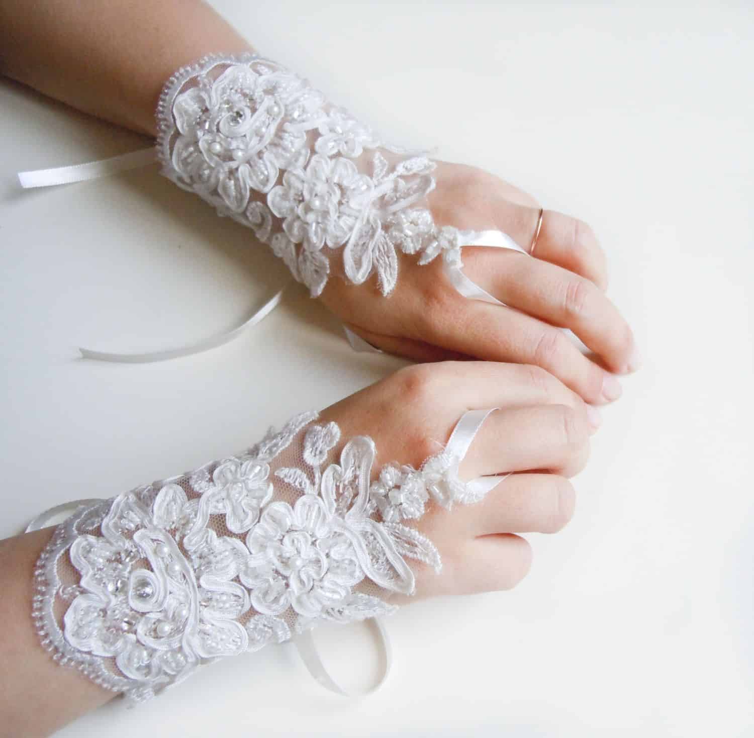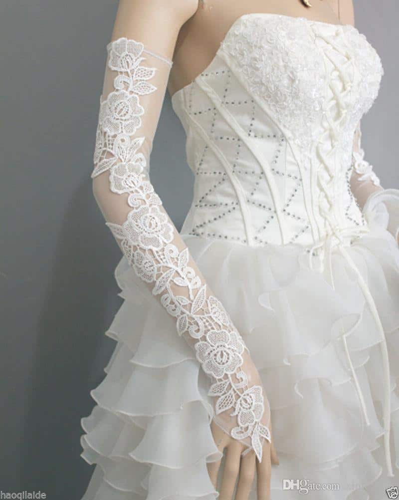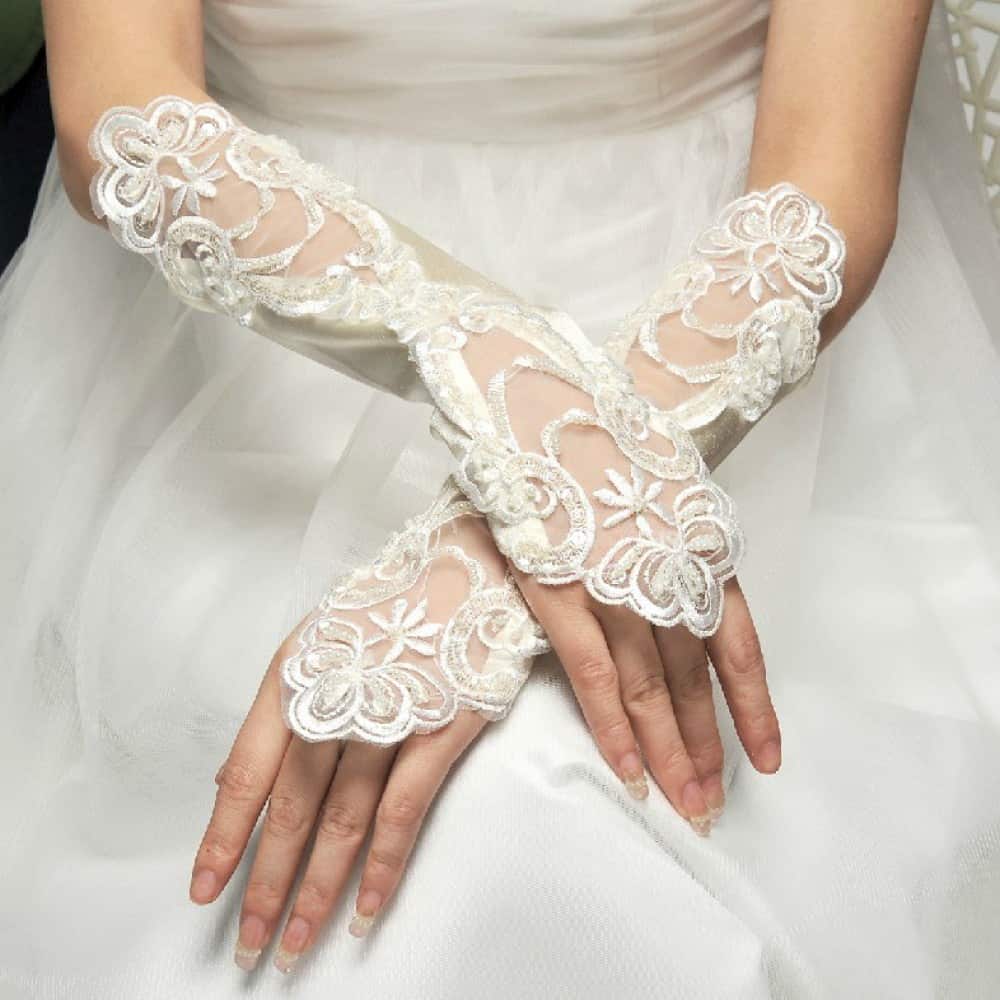 تأتي قفازات الزفاف منوعة من خامة الدانتيل الناعمة والرقيقة التي تناسب يوم الزفاف مع حبات من الخرز، أو خامة الشيفون مع نقوش من الدانتيل المميزة.