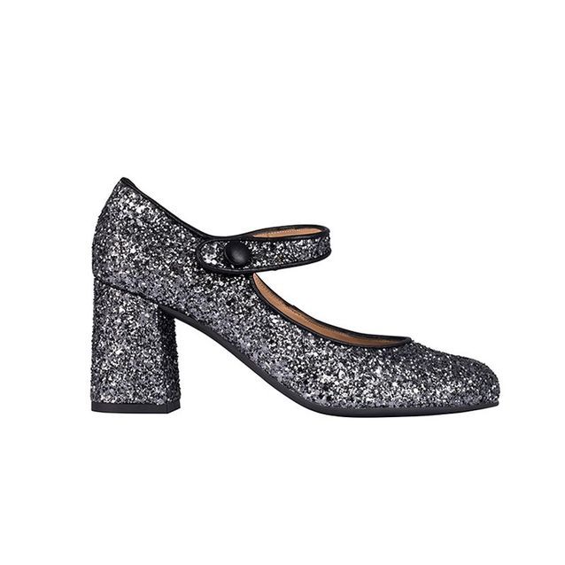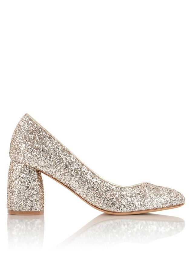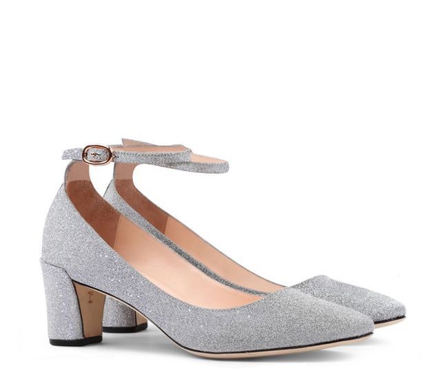 حذاء بكعب مربع مرتفع مزين بالترتر الناعم باللون الفضي البراق