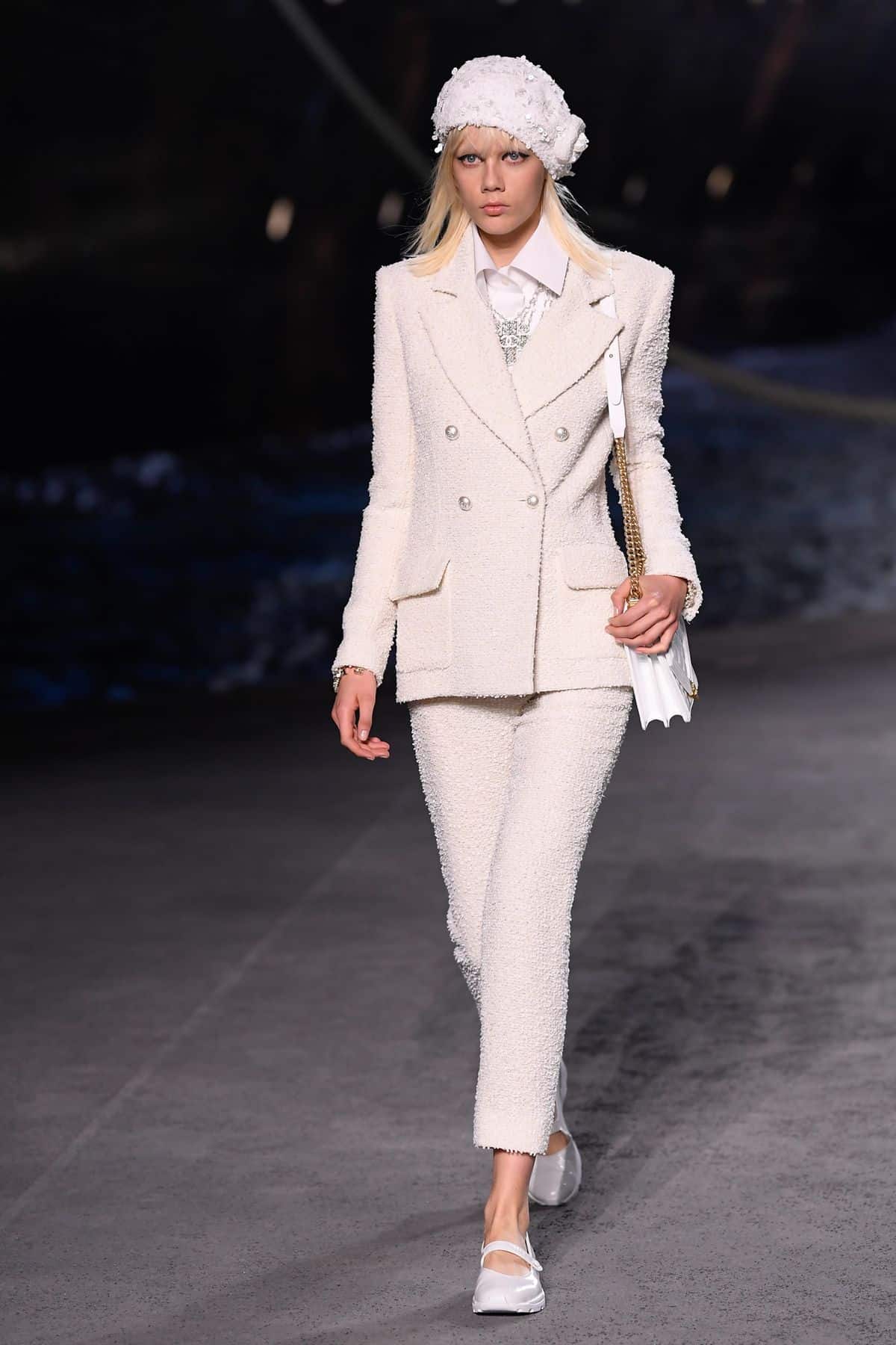 كما ستجدين سيدتي البدلات التويد المزينة بزهرة الكاميليا، والبناطيل البيضاء بقصات مختلفة لتصل لمنتصف الساق ومزينة باللؤلؤ الأبيض.