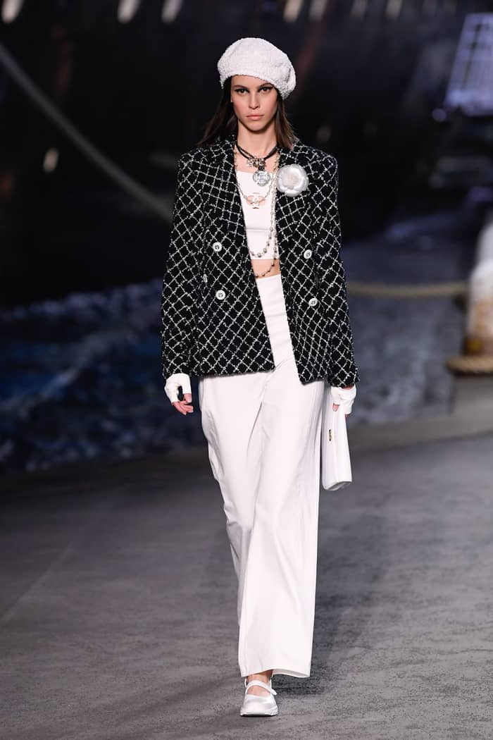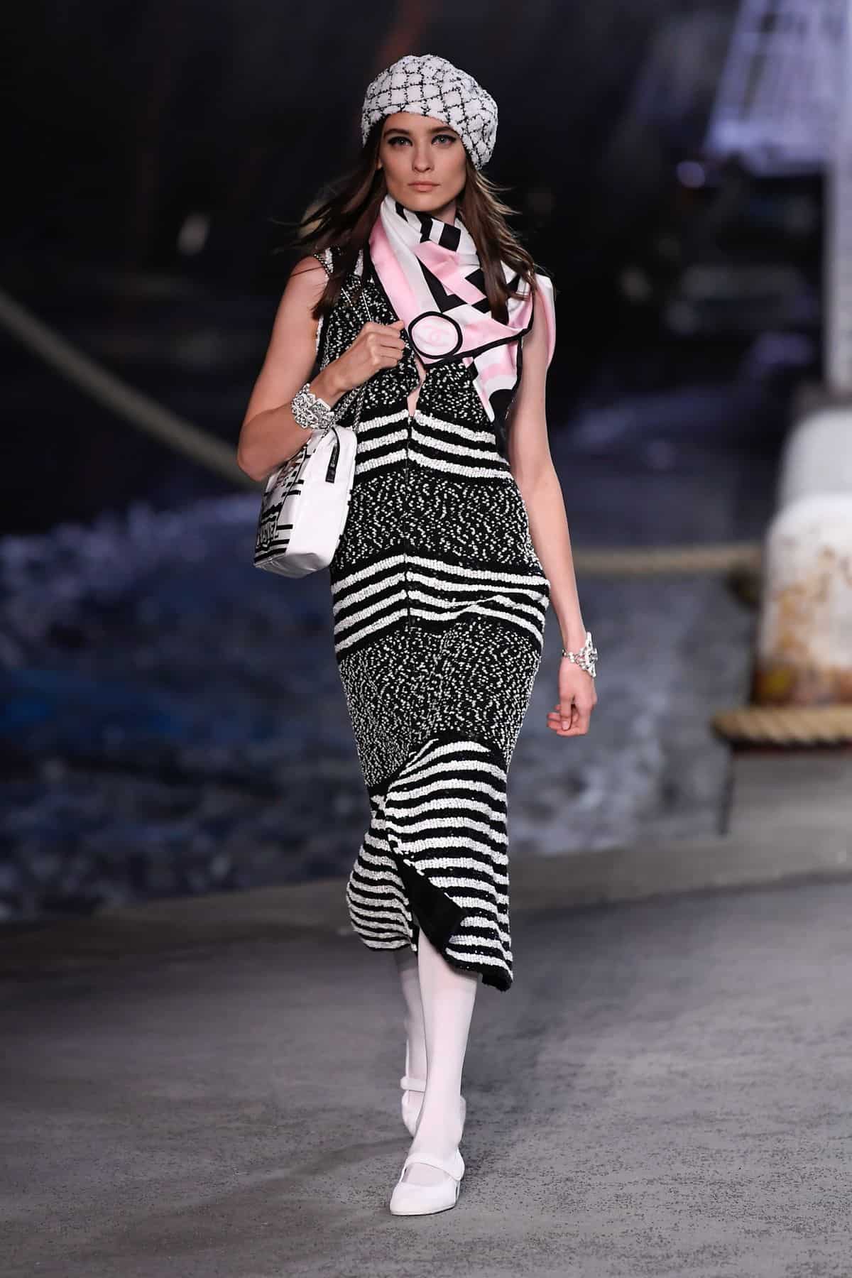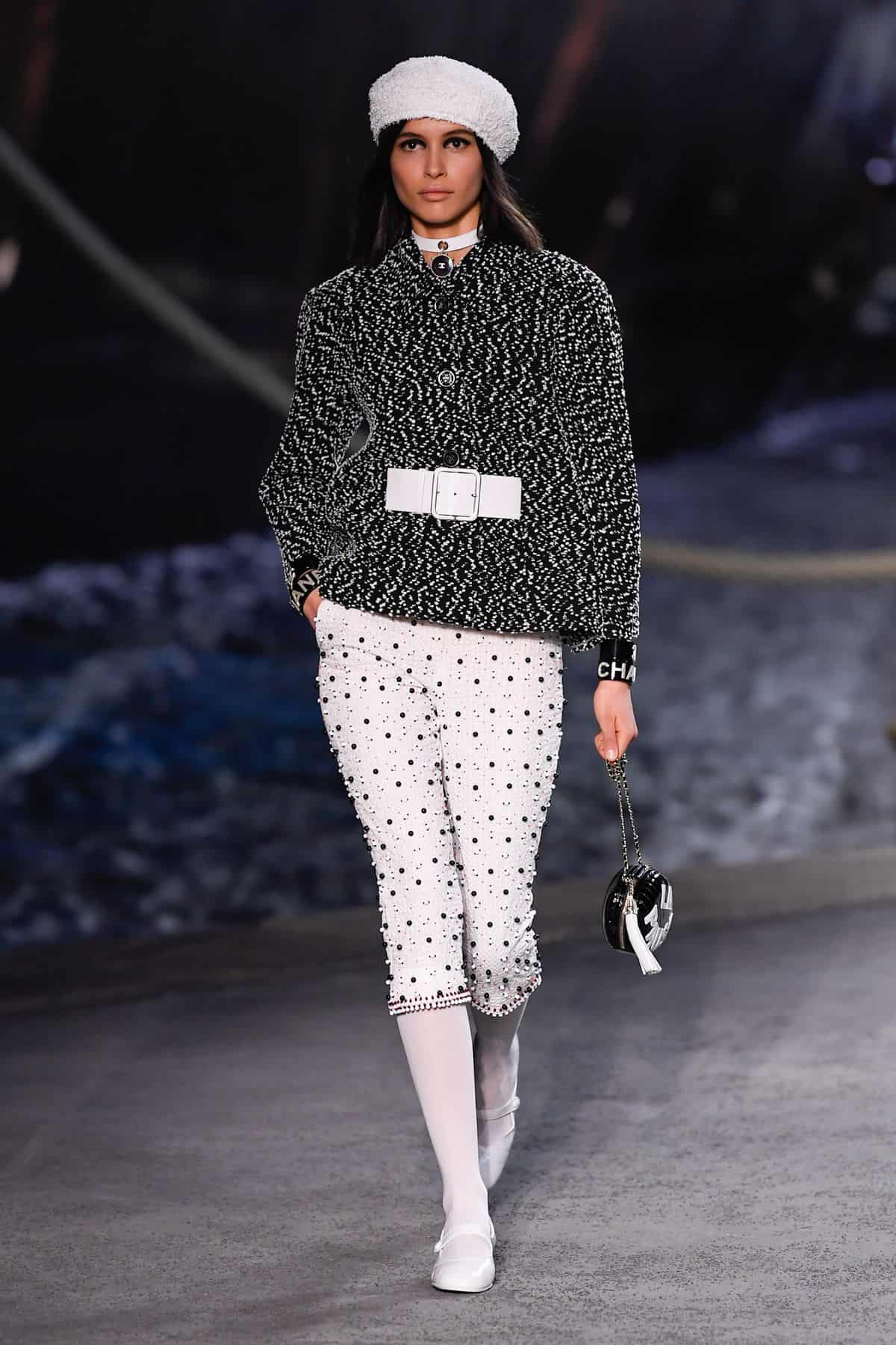 طرحت دار شانيل أيضًا مجموعة جديدة من البناطيل العالية الخصر والمخططة بشكل عمودي يمكنك تنسيقها مع كنزات مطبعة بشعار الدار الفرنسية العريقة.