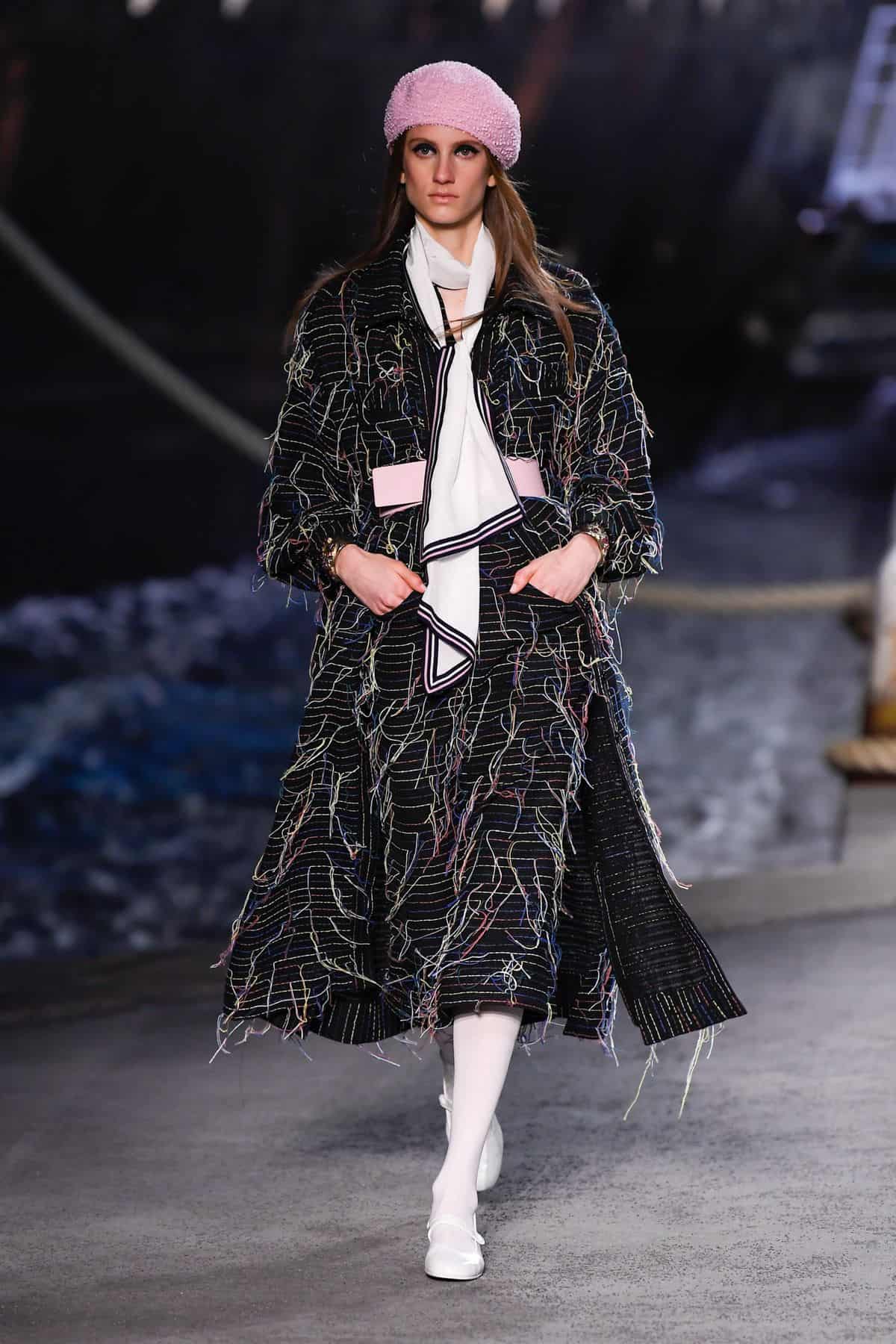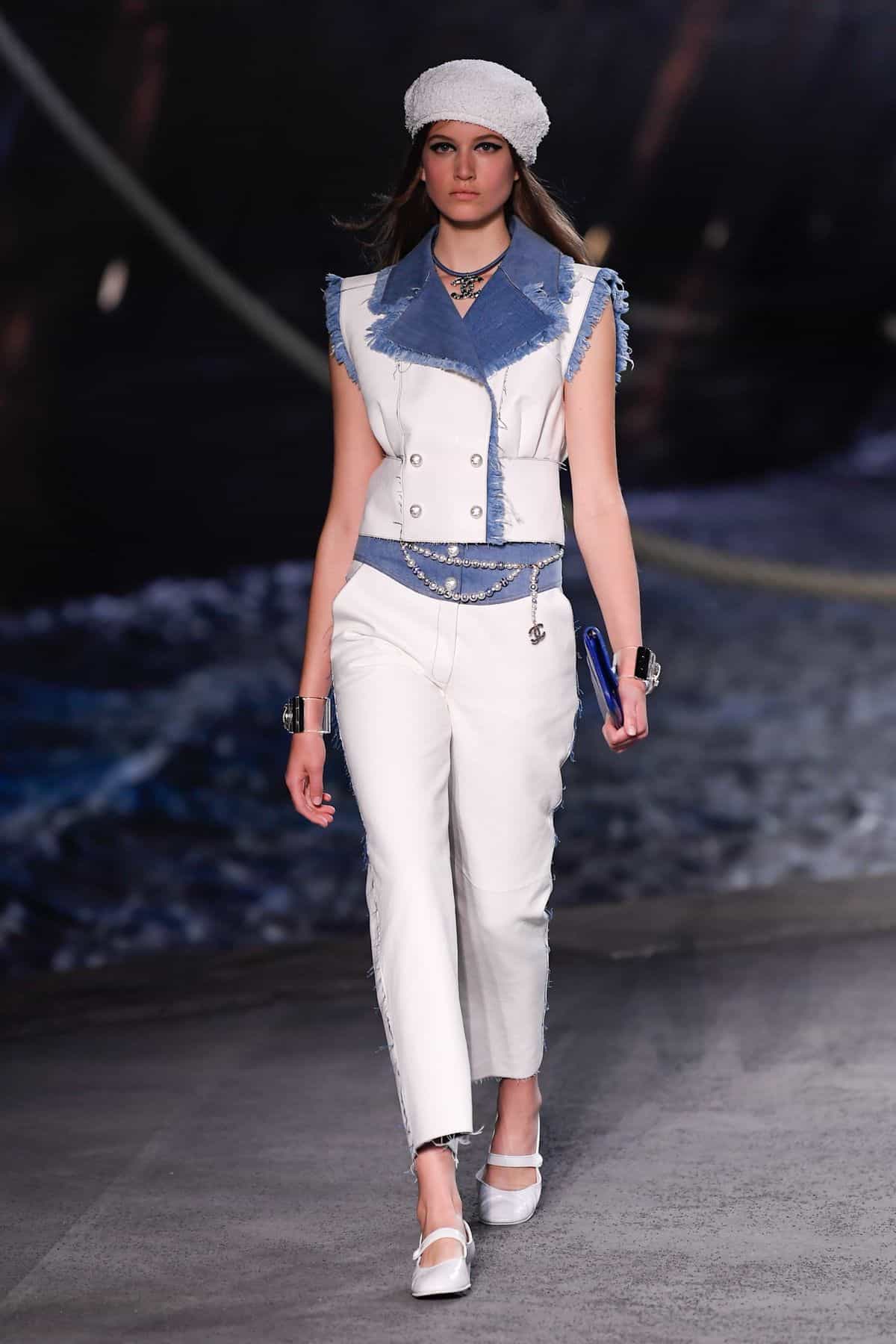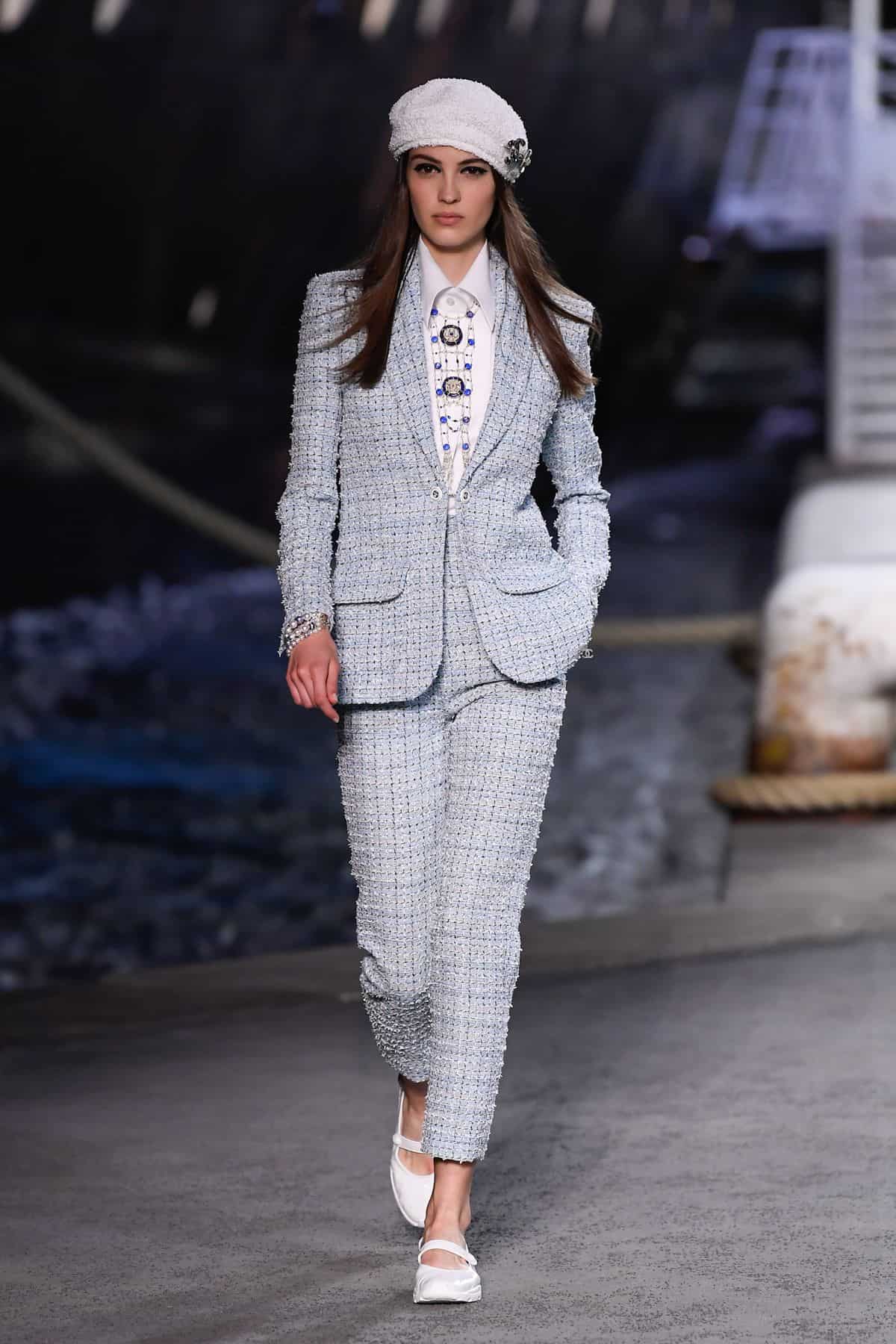 طرحت دار شانيل أيضًا مجموعة جديدة من البناطيل العالية الخصر والمخططة بشكل عمودي يمكنك تنسيقها مع كنزات مطبعة بشعار الدار الفرنسية العريقة.