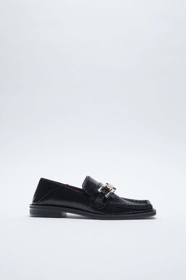 حذاء مسطح من الجلد الأسود بنقشة جلد الثعبان من علامة ZARA