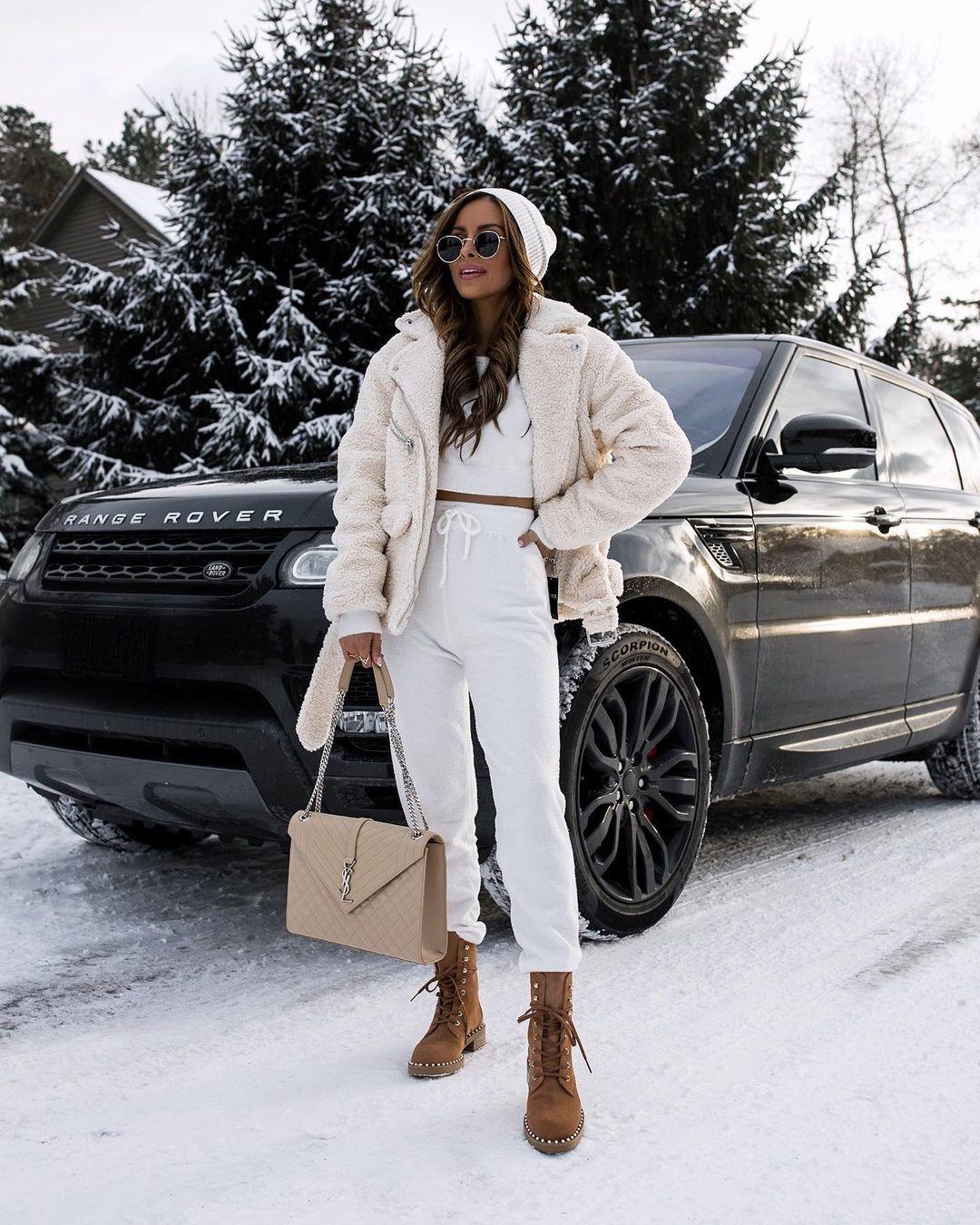 جاكيت فرو تيدي باللون الكريمي، يمكنك تنسقها مع بنطلون وتوب أبيض وبوت كاحل جملي.