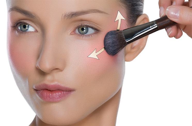 ضعي القليل من أحمر الخدود على الخد بحركة دائرية خفيفة، ثم ادمجيه انطلاقا من عظمة الخد باتجاه الخارج أي خط الشعر. تجنبي وضع البلاشر بشكل قريب من الأنف حتى لا تصاب عينيك بالاحمرار.
