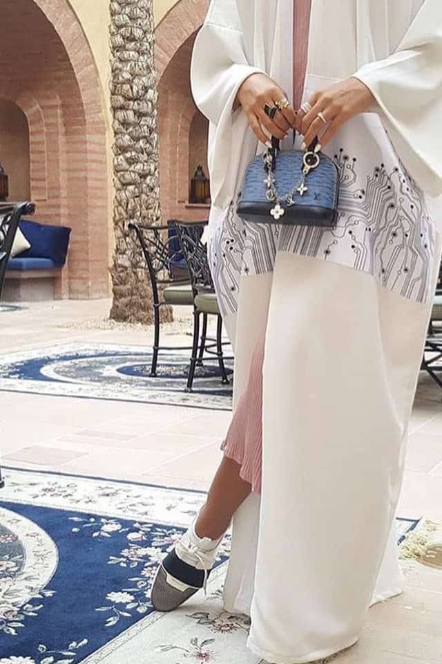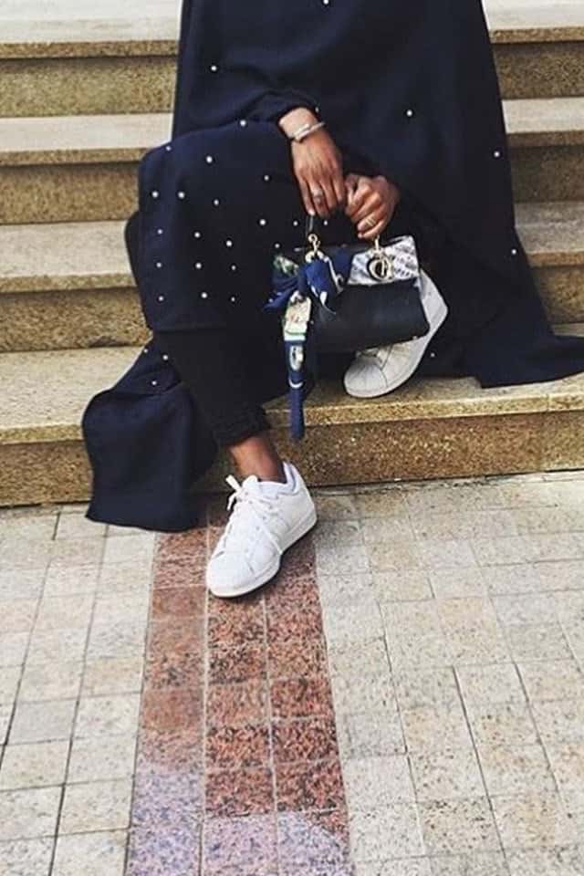 العباية العملية: العباية العملية تكون عادة خالية من أي تفاصيل أو نقوش وتكون قصير بعض الشيء من ناحية الطول حتى تضمن للسيدات التحرك بحرية في الفترة الصباحية. ننصحك سيدتي بارتداء الأحذية الرياضية الخفيفة باللون الأبيض أو أي لون موحد تفضلينه لتكتمل طلتك الصباحية العملية.