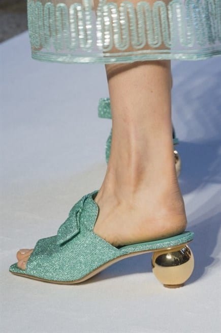 لإطلالة كلاسيكية، حذاء باللون الأخضر مع حبيبات براقة وخلخال يزين الكاحل.