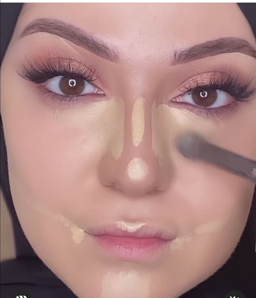 تحتاجين الآن لتطبيق الكونتور أو الكونسيلر بلون فاتح ابتداء من جوانب الأنف القريبة من الخدود وصولا إلى الجفون السفلية على أن  تمديه في شكل مثلث مقلوب، طبقيه أيضا عند منتصف الأنف وفي شكل نقطة صغيرة داخل الدائرة التي رسمتها باللون الداكن عند نهاية الأنف.