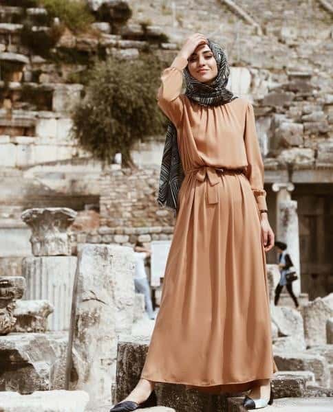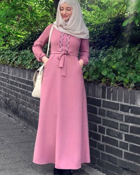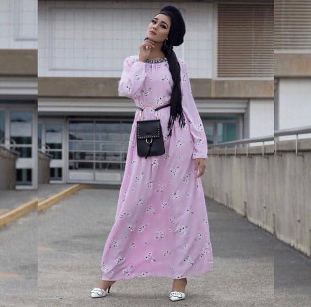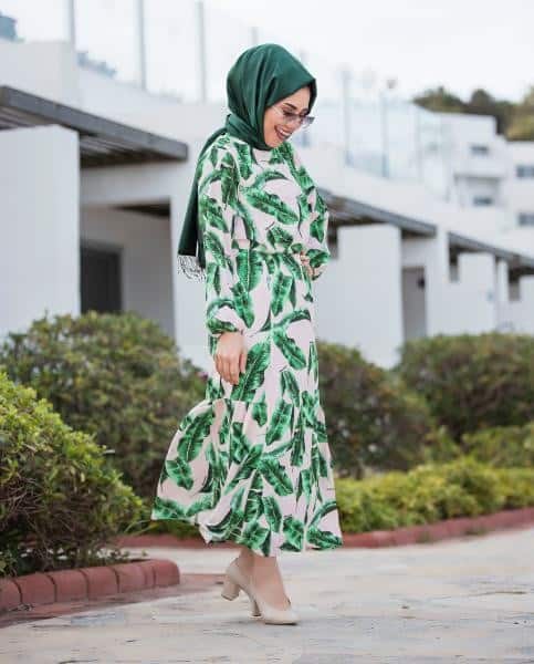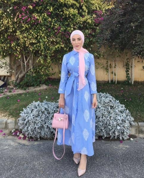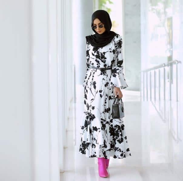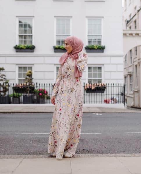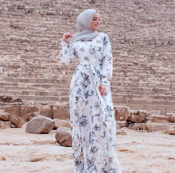- نسقي الفستان المطبع بالورود بحجاب بلون باستيل مثل النيود، الوردي أو الرمادي الفاتح.