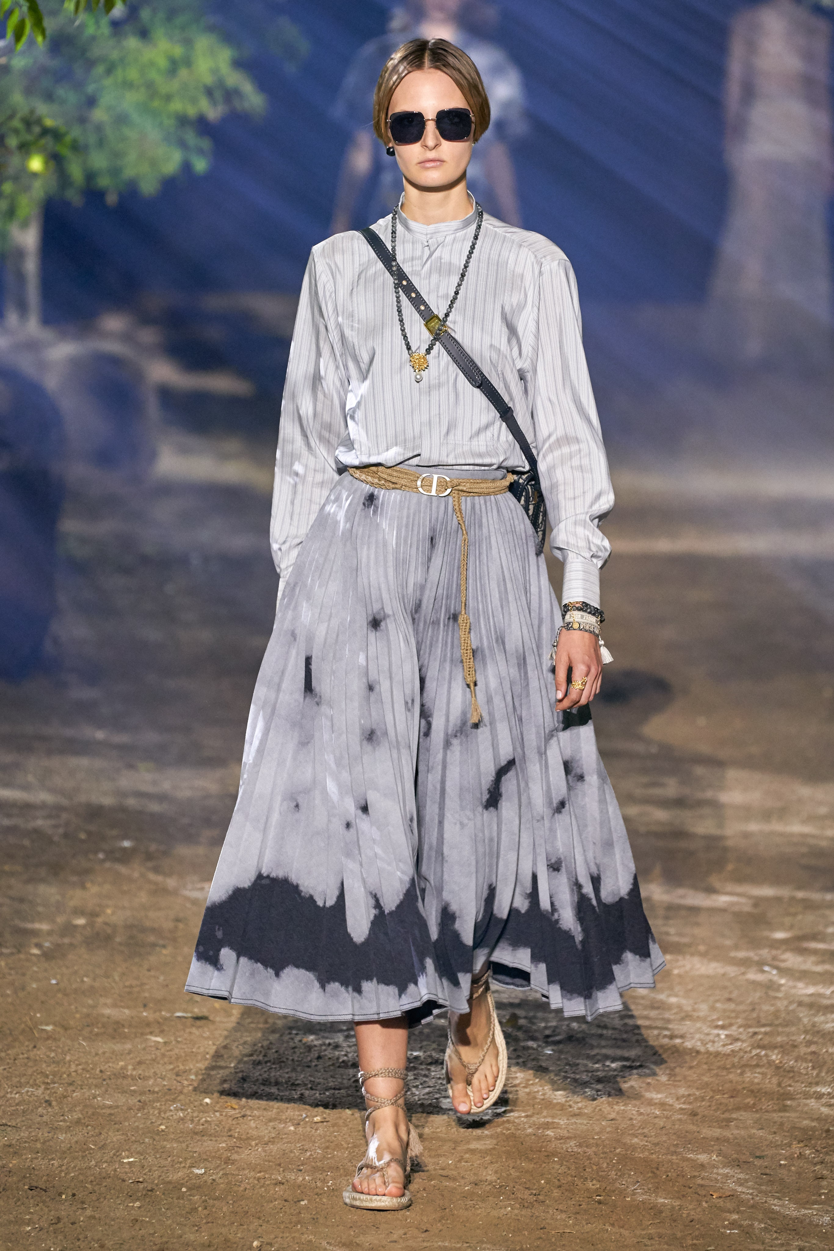 التنورة الماكسي البليسيه مع القميص المقلم: تعتبر التنورة بقصة البليسيه من أجمل القطع الرائجة هذا الموسم لذلك لا تترددي في تنسيقها مع قميص مقلم بنفس اللون مع ارتداء حزام قماشي عند الخصر.