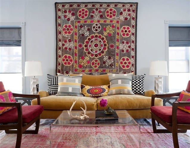 - احصلي على إطلالة عصرية أنيقة من خلال تنسيق السجاد الحائطي برسومات جذابة مع السجاد الأرضي وقطع من الأثاث البسيط.