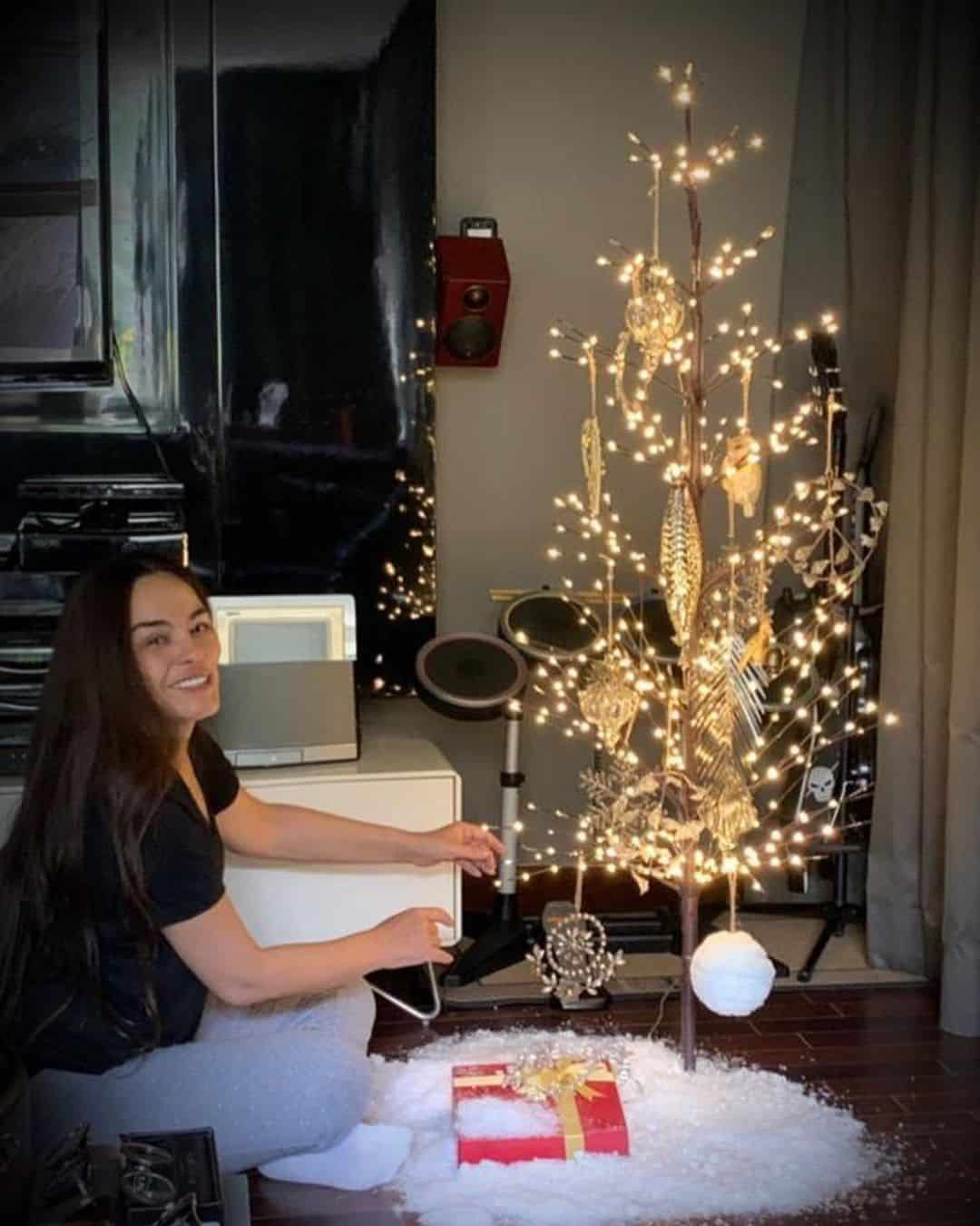 شريهان أطلت بشكل عفوي في الصور دون وضع أي مساحيق تجميل وبملابس كاجوال، وقد جلست قرب شجرة الزينة المضيئة.
