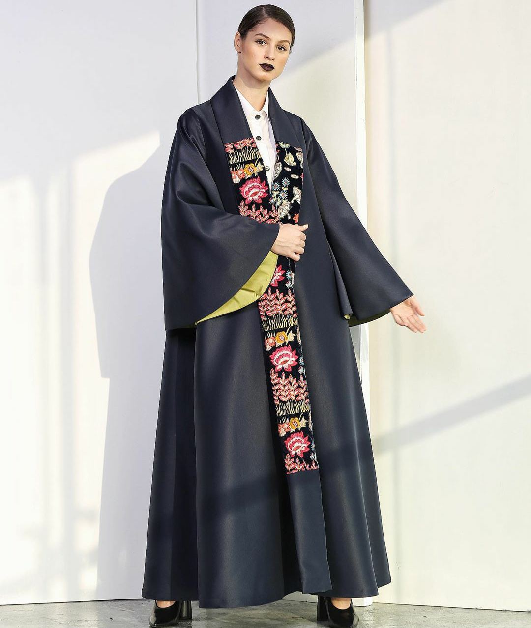 عباية سوداء بقصة الكيمونو وهو تصميم مناسب لإخفاء الوزن الزائد في منطقة البطن.