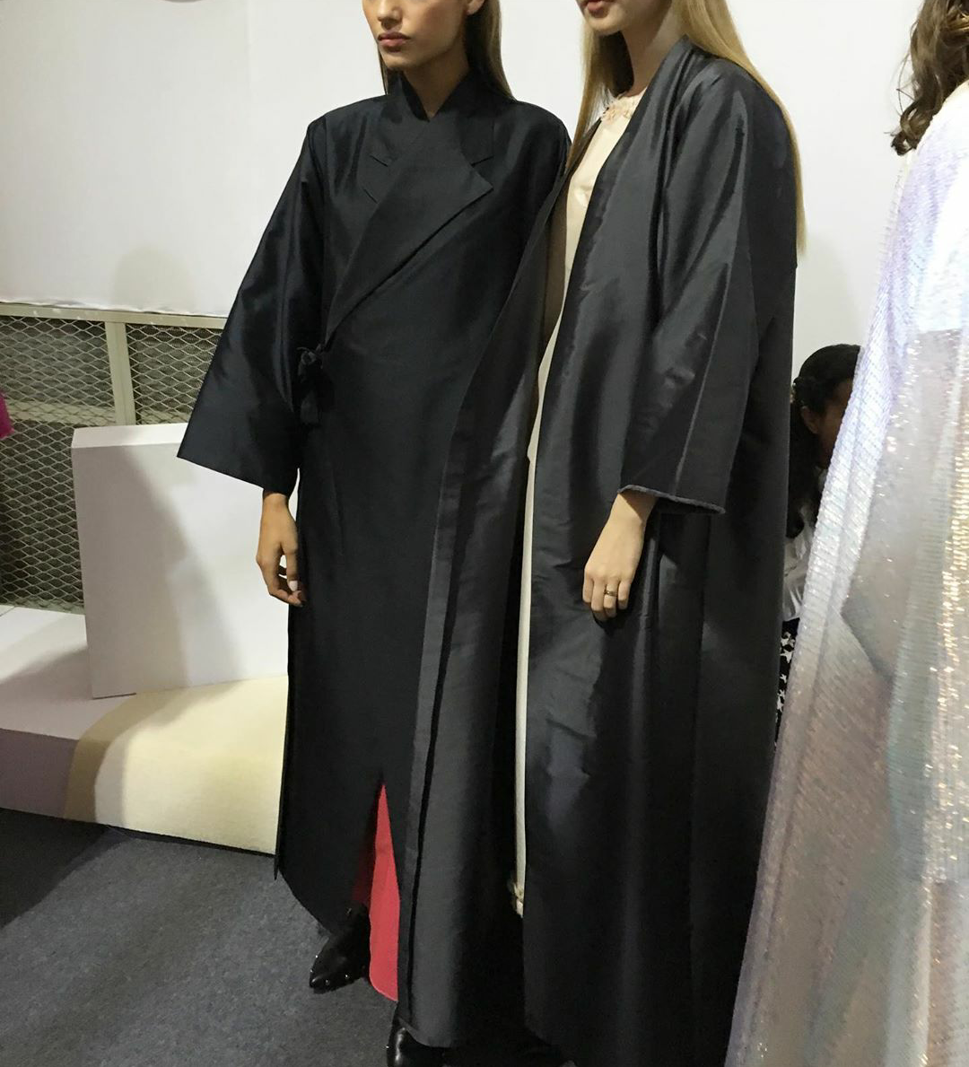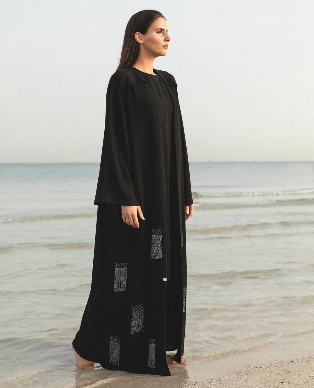 عباية سوداء مفتوحة مع قصة الجرس عند الذراعين وهي تصميم مناسب لإخفاء الوزن الزائد في منطقة الذراعين والصدر.