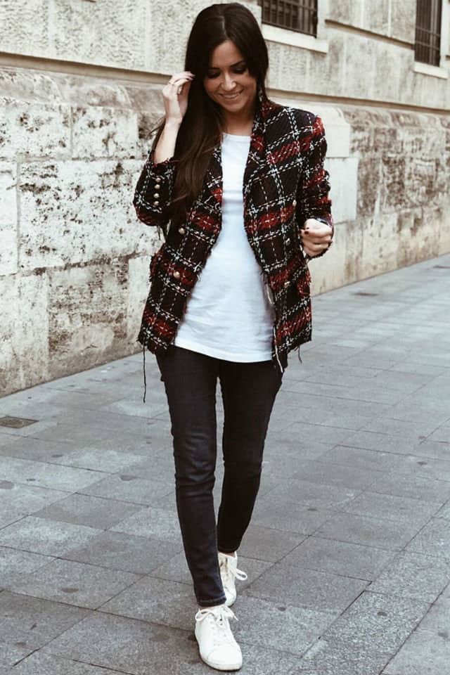 بعد انتهاء الشهر الثالث من الحمل، تبدأ بطنك تظهر تدريجيًا وبشكل واضح، لذلك تستطعين سيدتي اختيار بليزر بلون مميز وجذاب مع تي شيرت فضفاض، بنطلون حمل يكون لونه متناسق مع إطلالتك. استبدلي الكعب العالي بالأحذية الرياضية أو الأرضية.