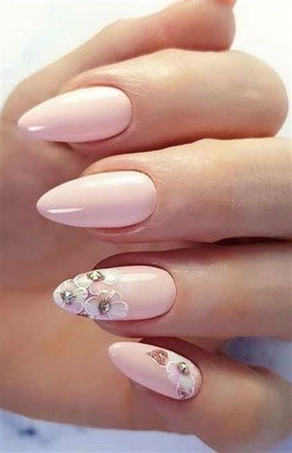 استمتعي باللون الزهري الفاتح ورسوم عند الخنصر والبنصر مع حبات الستراس الجذابة