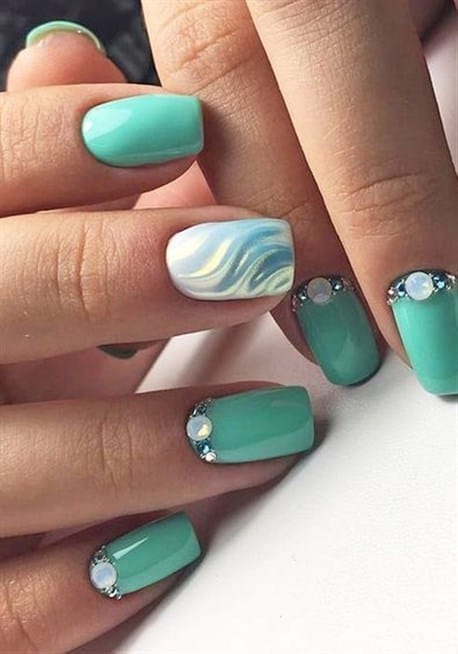 تناسق ساحر بين الأخضر الباستيل مع الفضي المموج عند الإصبع الوسط مع حبات الستراس أعلى الأظافر.