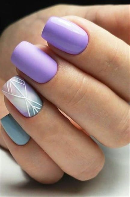 مناكير أظافر يجمع بين الزهري والأزرق الباستيل مع مثلثات بالفضي البراق عند أعلى الأظافر.