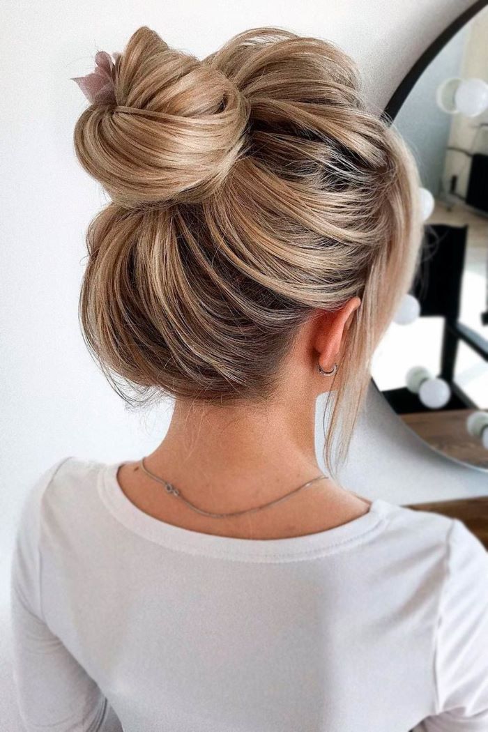 تسريحة كعكة مرتفعة مع خصلات مموجة أنيقة وجذابة للشعر القصير، يمكنك إضافة بعض دبابيس الشعر إذا أردت حضور سهرة ما.