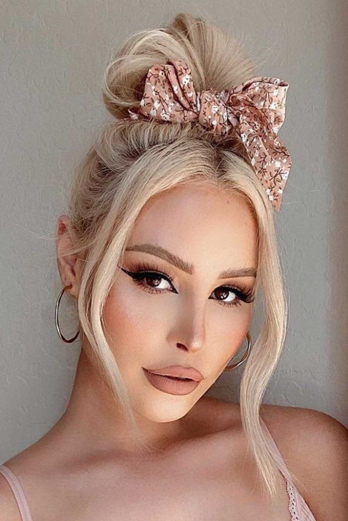 تسريحة بف عفوية مرفوعة لأعلى مزينة بإكسسوار قماشي في شكل فيونكة جذابة مع خصلات جانبية منسدلة عند الغرة.