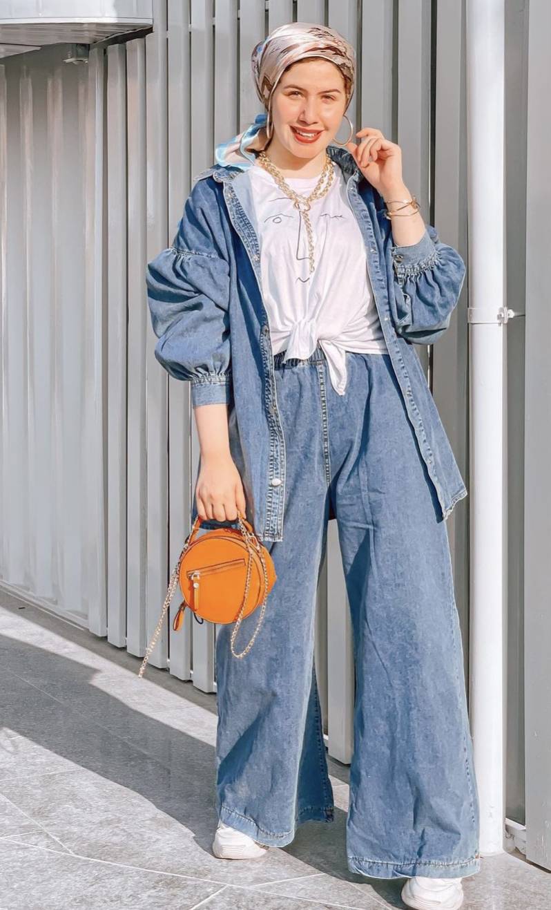 إطلالة موحدة من الجينز عملية وأنيقة، يمكنك ارتداء بنطلون جينز فضفاض مع جاكيت بنفس اللون وتي شيرت باللون الأبيض.