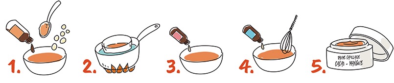 نضع زيت البيكوي في وعاء ثم نضيف كل من زبدة الكاكاو وزبدة المانجو ونذيب المكونات في غلاية مزدوجة حتى تذوب وتتجانس.