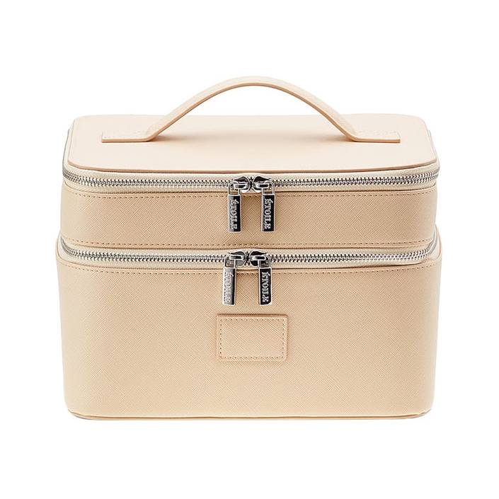 حقيبة يد جلدية باللون البيج بتصميم ناعم وجذاب بتقنية مبتكرة تسمح بالحفاظ على درجة حرارة مناسبة لحماية مستحضرات التجميل حتى أثناء السفر.