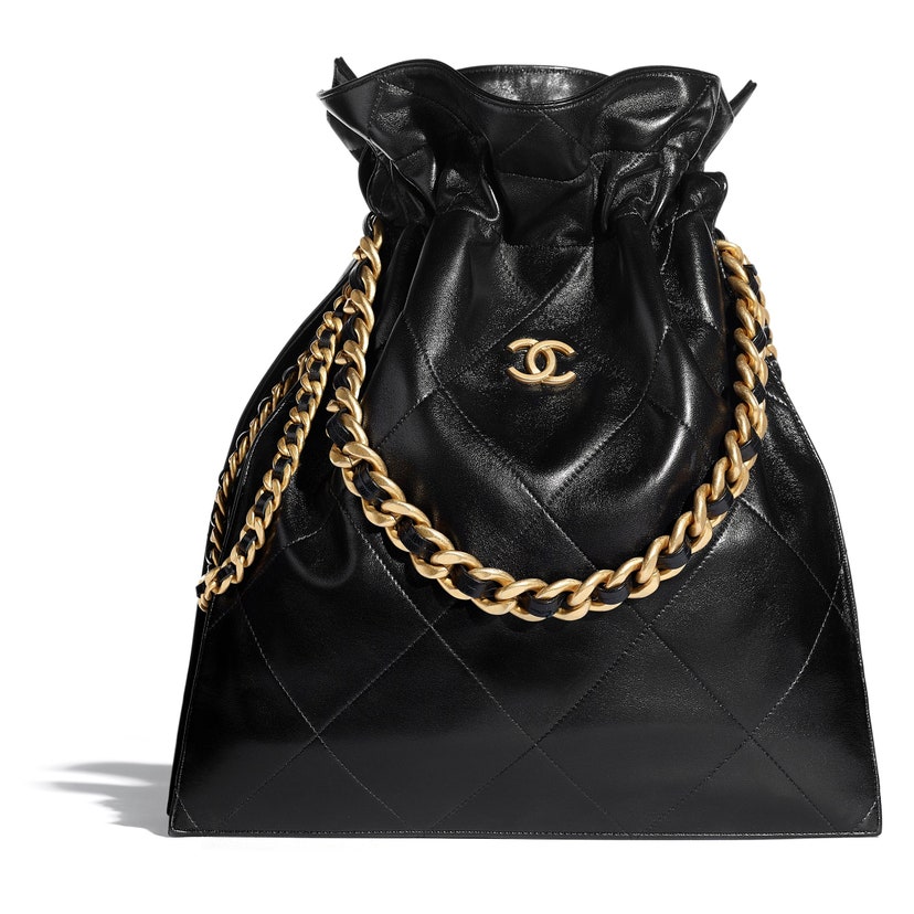 حقيبة يد من الجلد الأسود على شكل دلو مع إكسسوارات ذهبية اللون من علامة شانيل.
