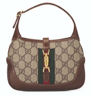حقيبة يد بتصميم كلاسيكي مصنوعة بأسلوب أنيق يجمع بين القماش والجلد مع شعار علامة غوتشي.