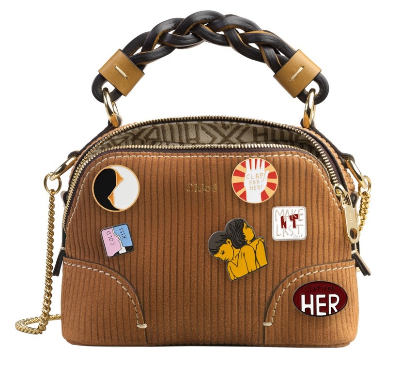 حقيبة يد صغيرة مصنوعة من قماش المخمل مع مسكة من الجلد مزينة بدبابيس بأشكال مرحة من علامة كلوي.