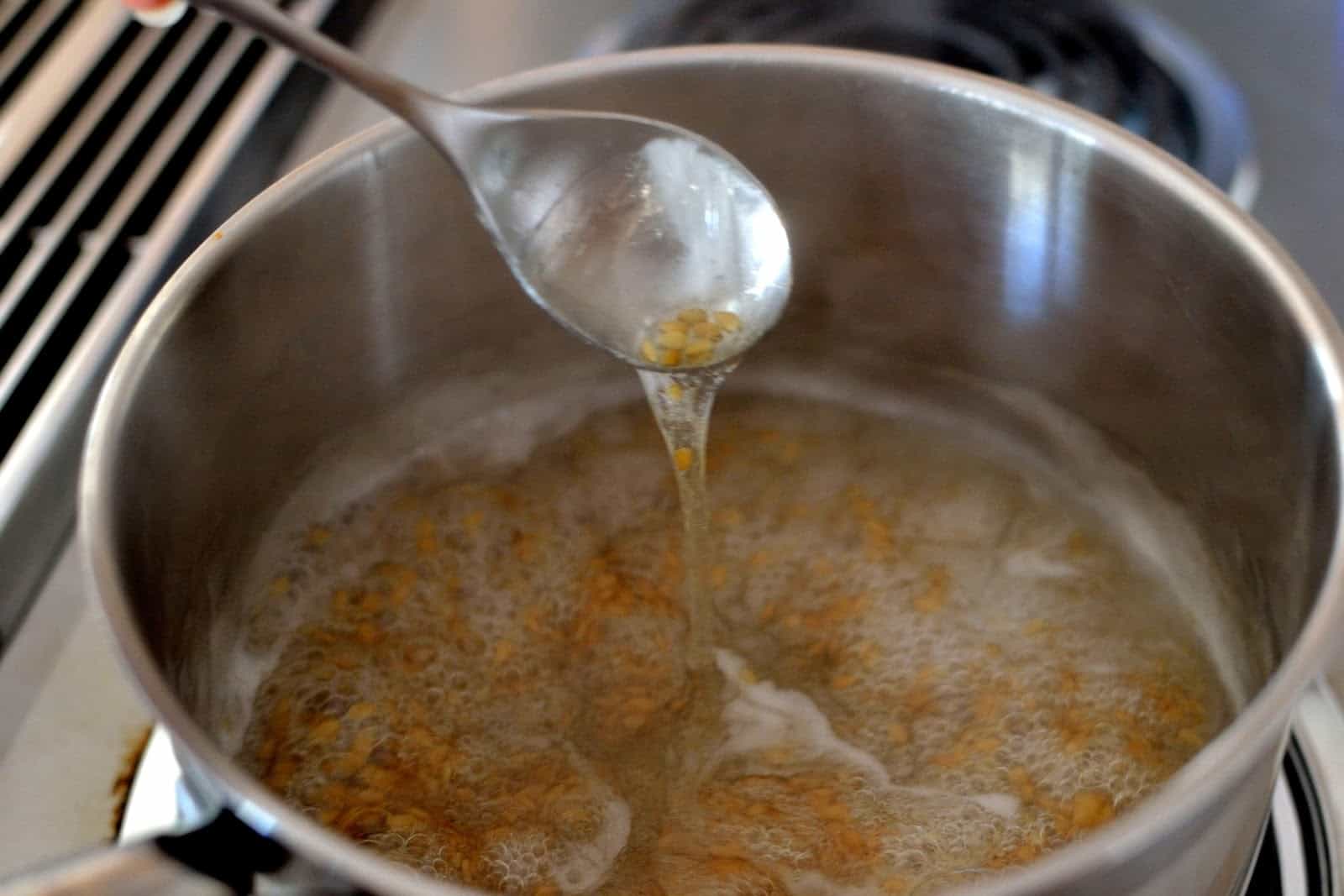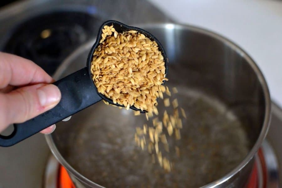 - في وعاء معدني، اسكبي الماء ثم أضيفي له بذور الكتان واتركيه يغلي على نار هادئة حتى يتحول الماء إلى مزيج هلامي كثيف.