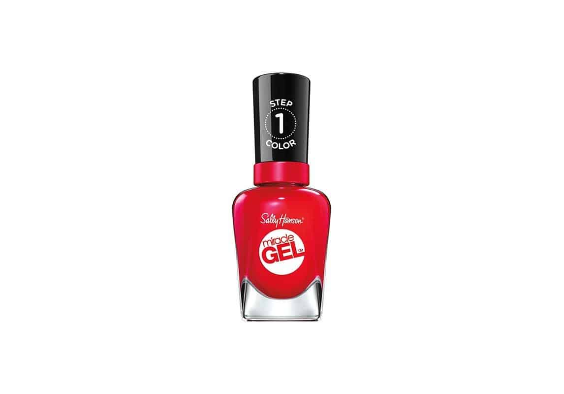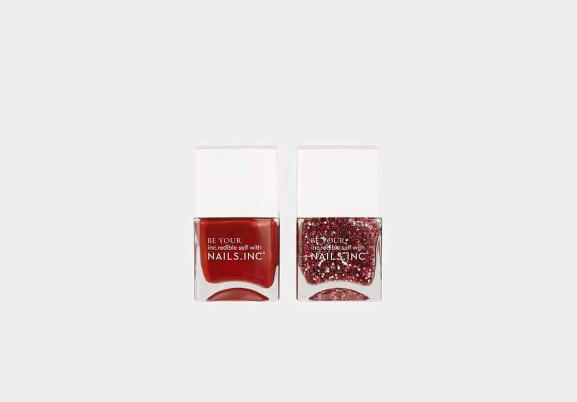 طلاء باللون الأحمر المعتاد مرفق بعلبة طلاء تتضمن حبيبات براقة لتحصلي على إطلالة مناكير رائعة.