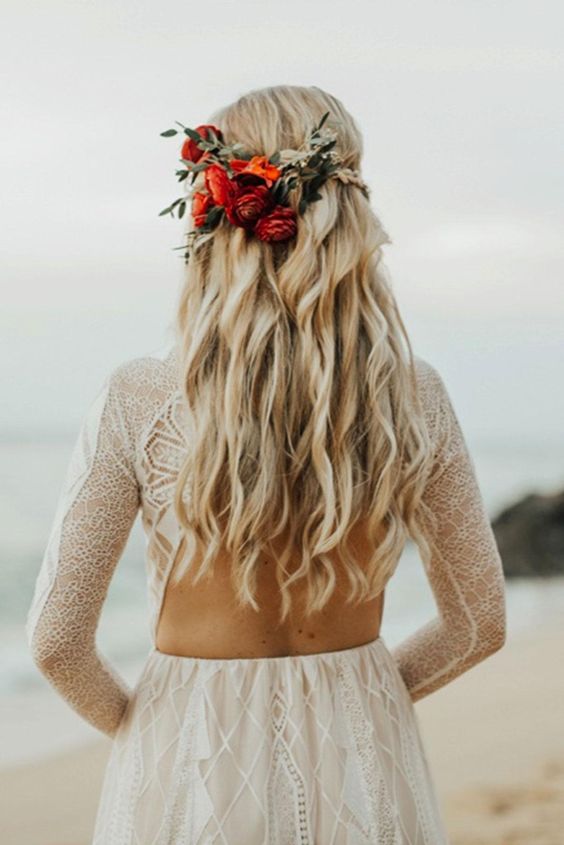تسريحة شعر ويفي منسدلة مع أزهار باللون الأحمر مثبتة عند منتصف التسريحة.