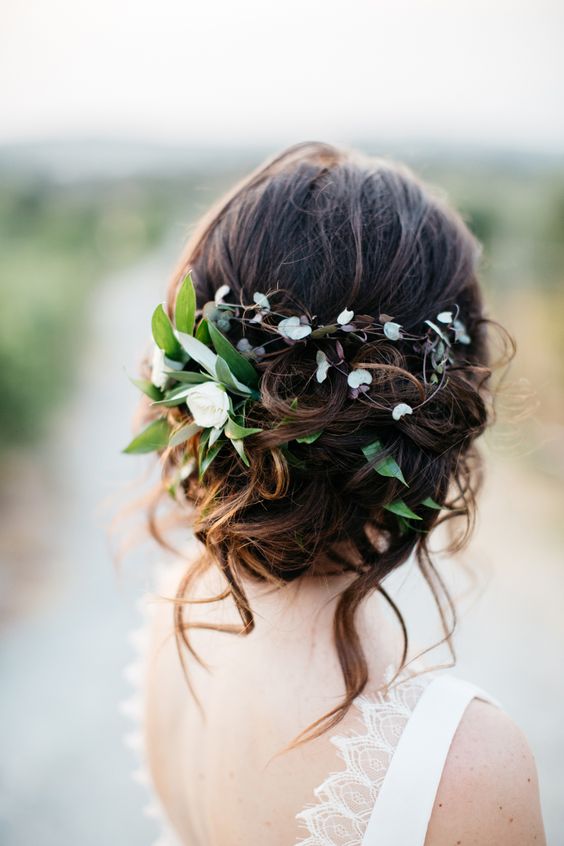 تسريحة شعر فوضوية نصف مرفوعة مع إكليل رفيع من الأغصان مزين بالأزهار باللون الأبيض مثبت للخلف.
