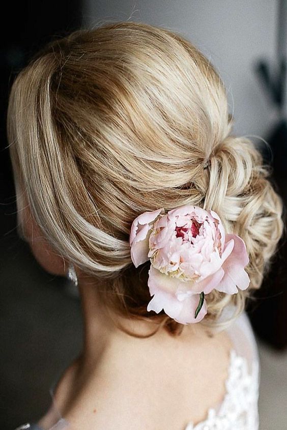 تسريحة شعر منخفضة مع أزهار الفاونيا مدمجة داخل الشعر.