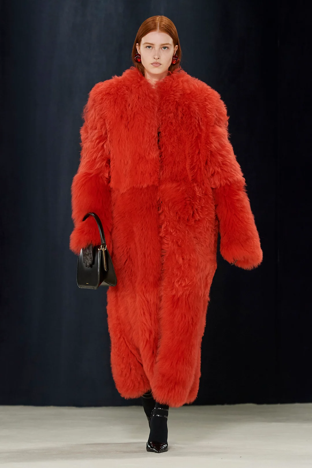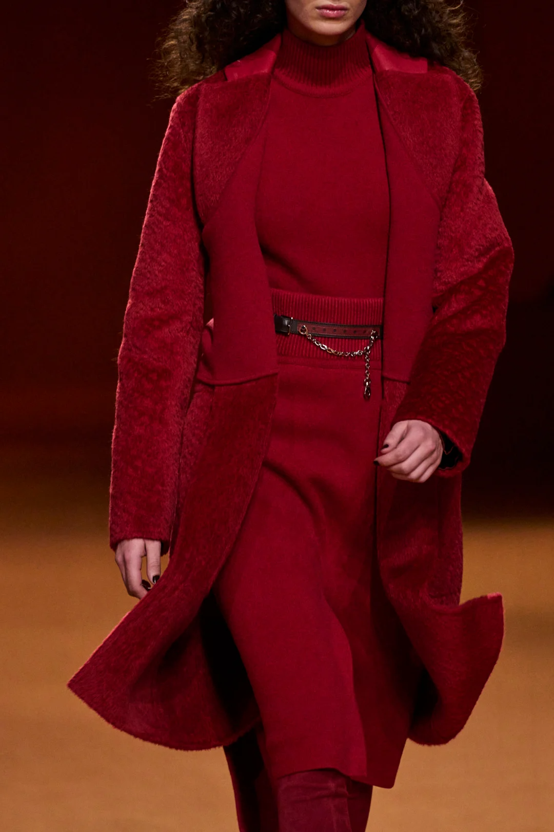 معطف أحمر من تصميم هيرماس مصنوع من الفرو القصير والمحبوك مع قصات من خامة الكاشمير على طرف الياقة والخصر.