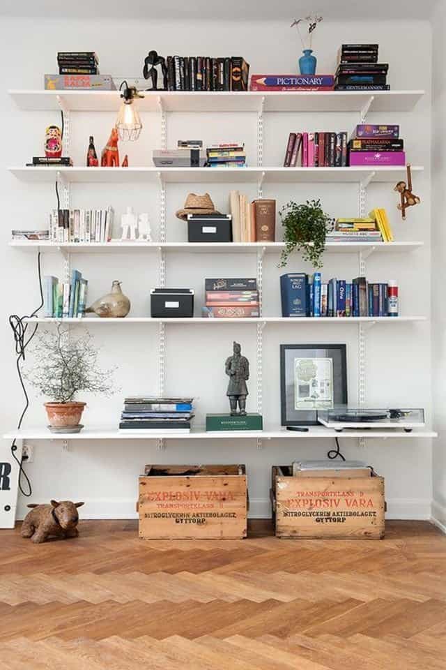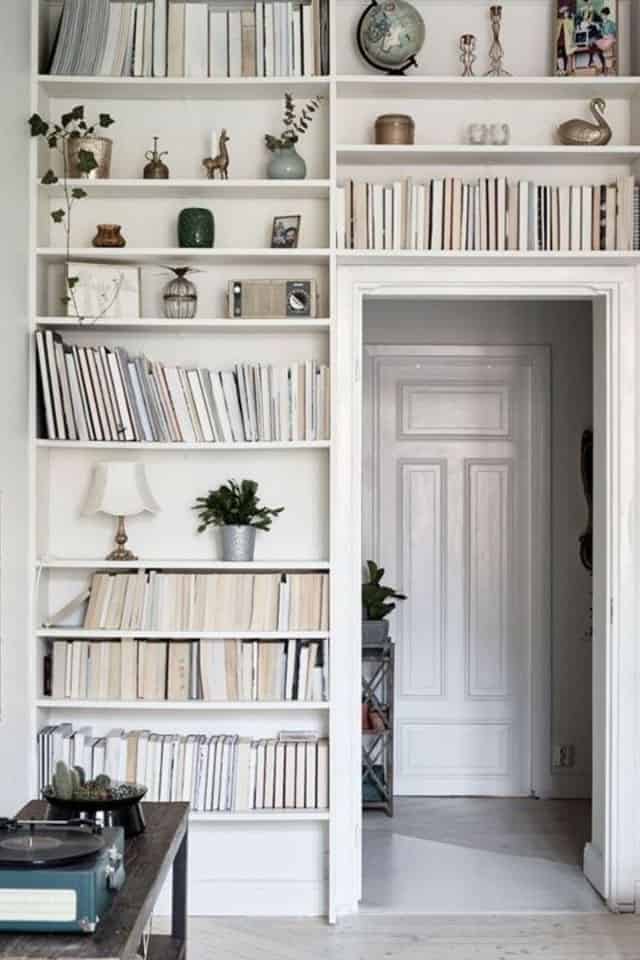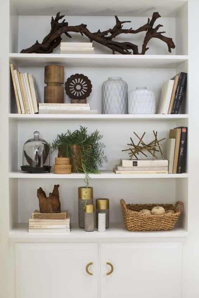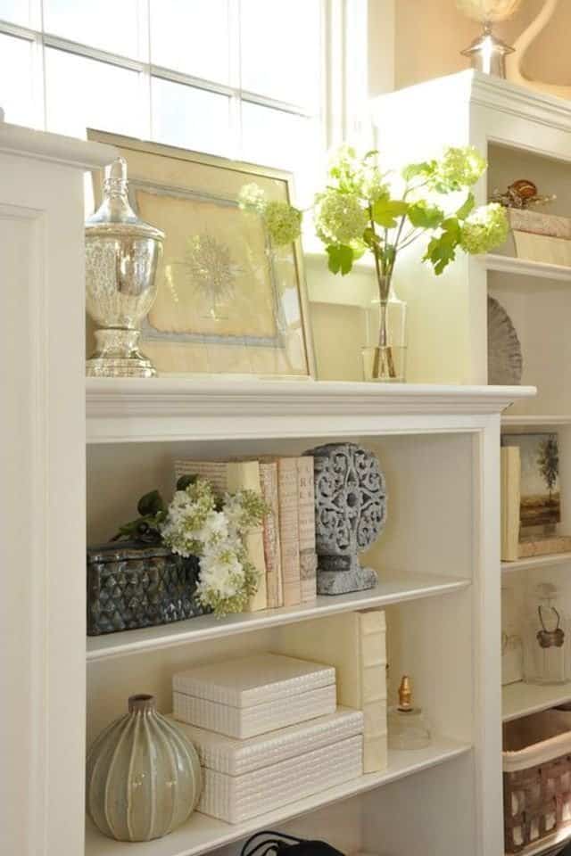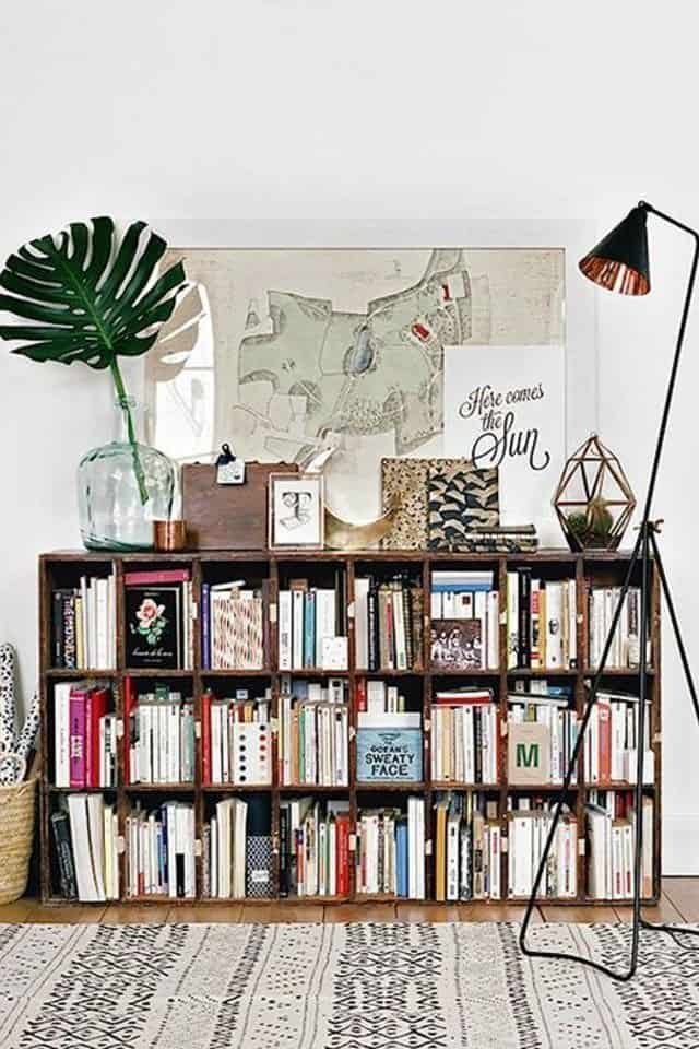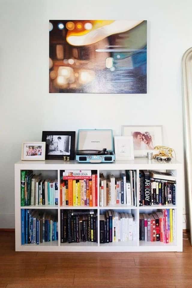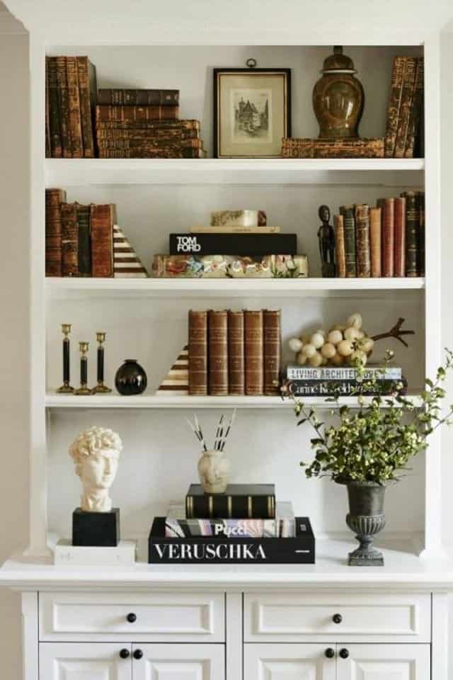 يمكنك وضع قطعة فنية صغيرة بين الكتب المصفوفة بشكل أفقي أو فوق المكتبة.