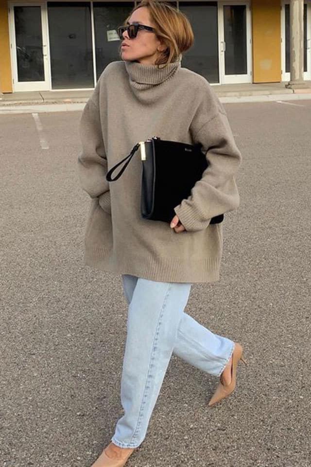 تعتقد الكثيرات أنه لايمكن ارتداء البلوفر الواسع في الخرجات والحفلات، في حين أنه يمكنك تنسيقه بشكل جذاب مع قطعة أخرى لامعة أو من الجلد.