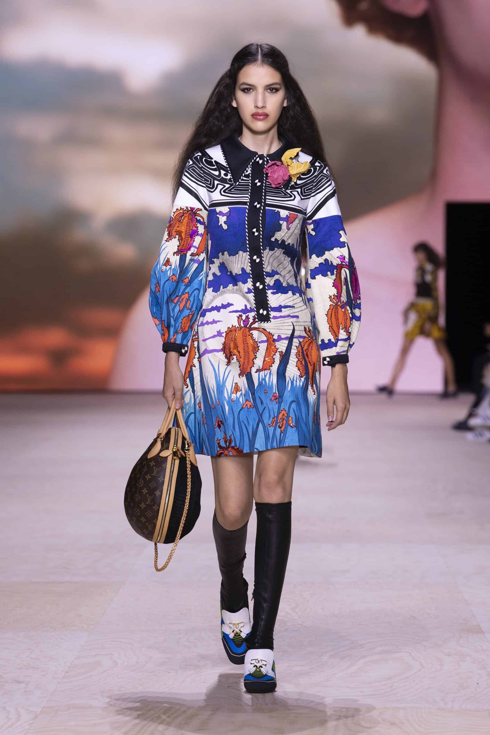 يتميز هذا الفستان بأزرار في الصدرية مطبوع بالزهور الملونة من عرض الأزياء الخاص بـ لوي فيتون لربيع وصيف 2020