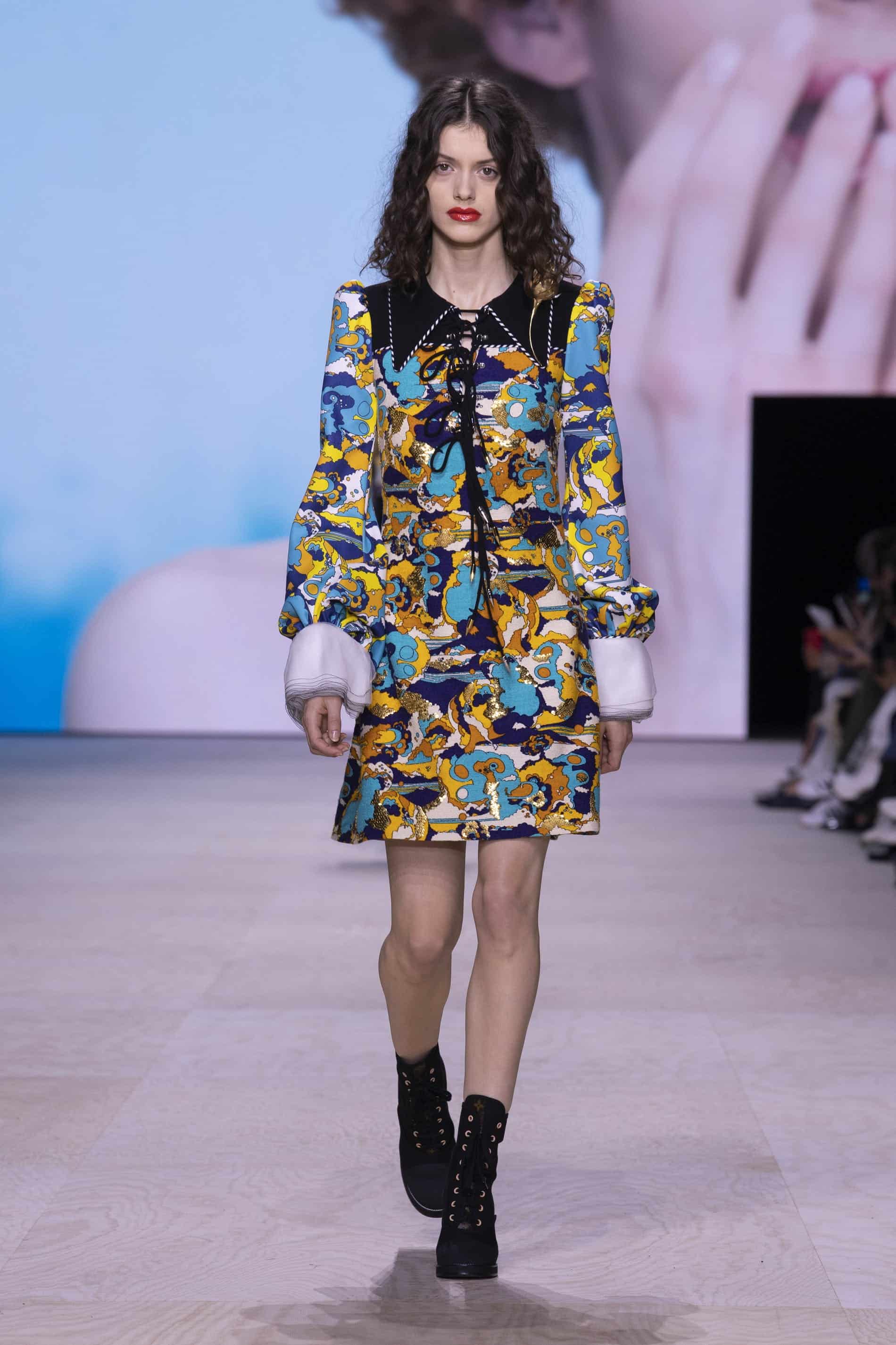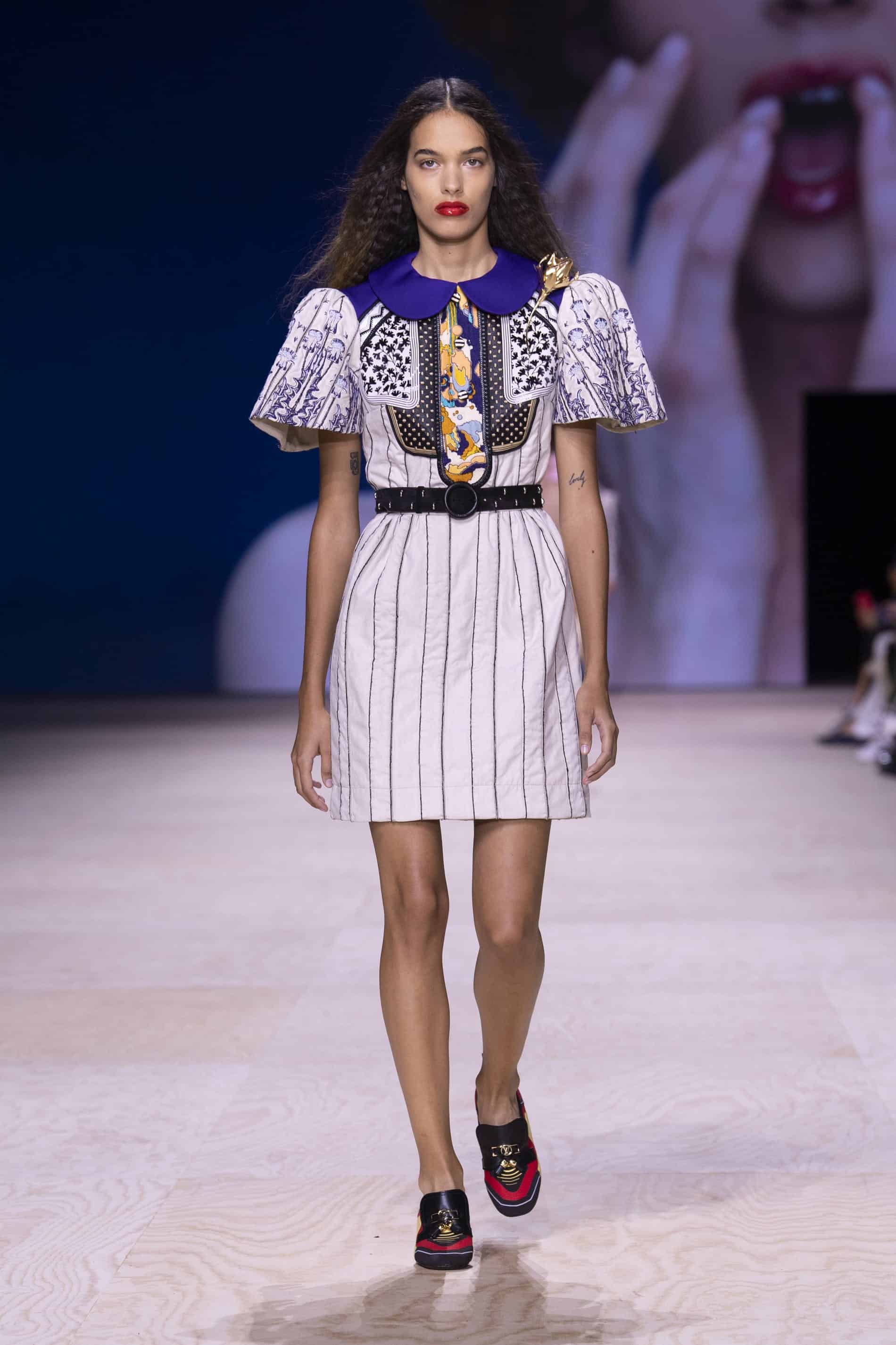 - فستان بمطبوعات زرقاء وذهبية مرحة وياقة سوداء وأكمام منفوشة تنتهي بطبقات متعددة من الأورغانزا البيضاء من عرض الأزياء الخاص بـ لوي فيتون لربيع/صيف 2020