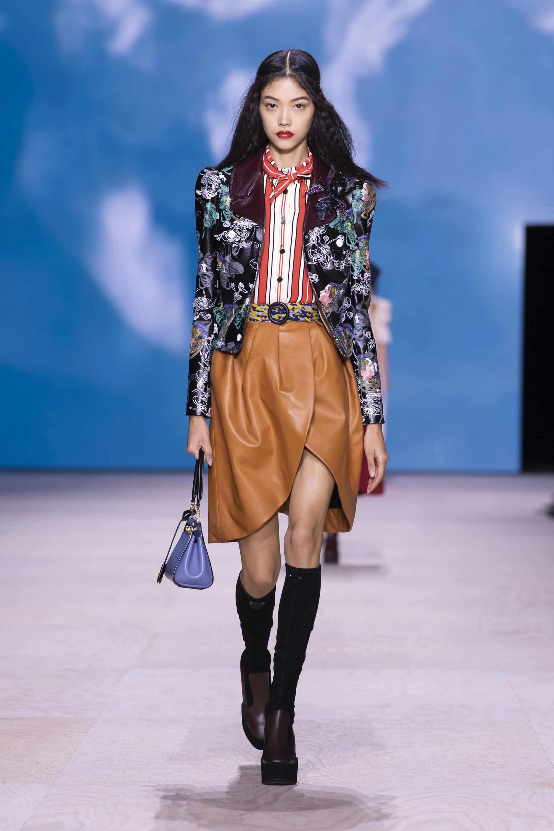 - سترة بتصاميم هندسية زهرية وباج تعلوها جاكيت من الجلد الأسود مع حزام أخضر مرح وتنورة قصيرة بتصاميم مربعة بنية وباج مع قصة من الجانب من عرض أزياء لوي فيتون لربيع/صيف 2020