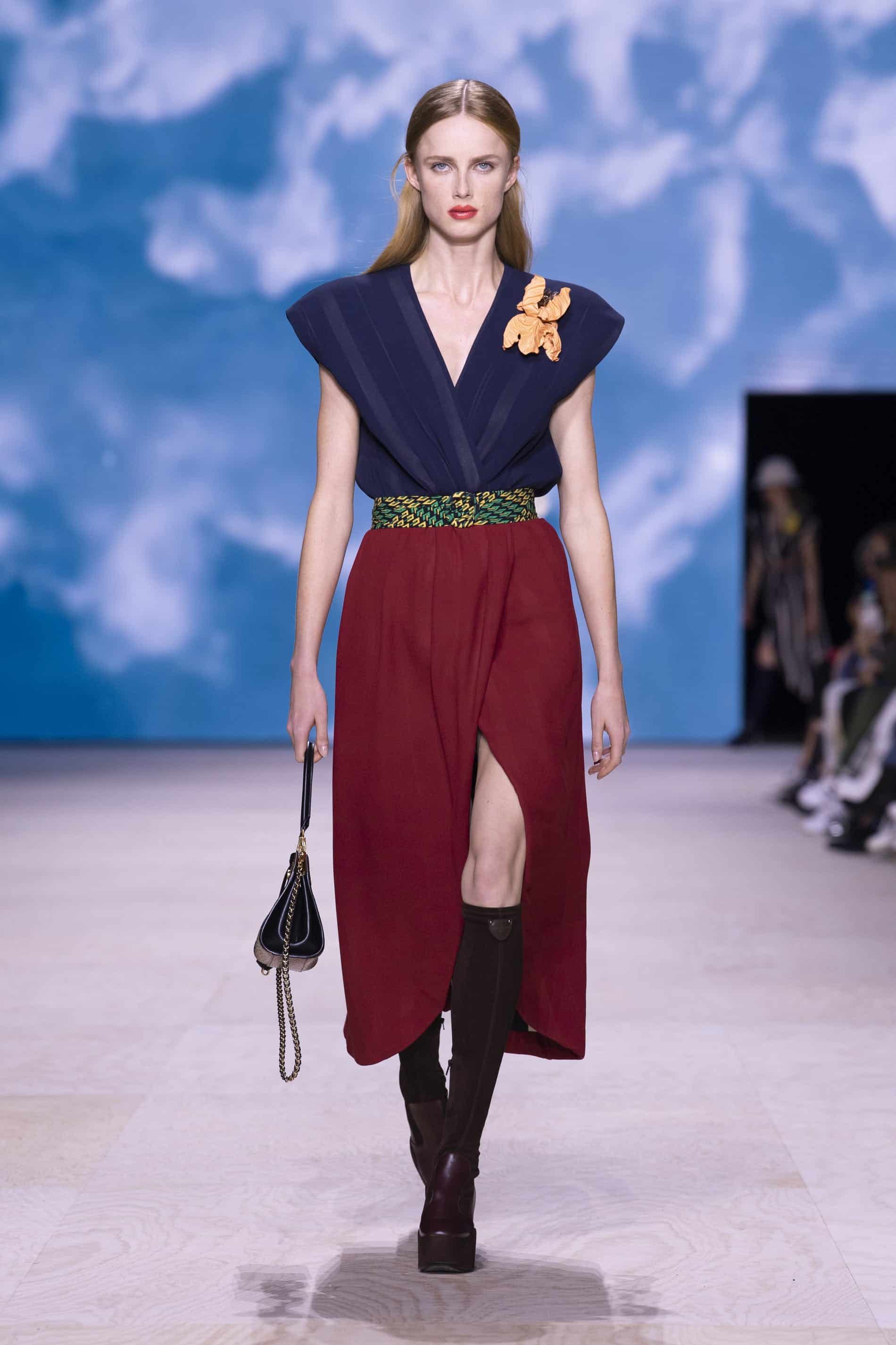 - الزي يحتوي أيضا على تنورة حمراء مفتوحة من الوسط من عرض الأزياء الخاص بـ لوي فيتون لربيع/صيف 2020