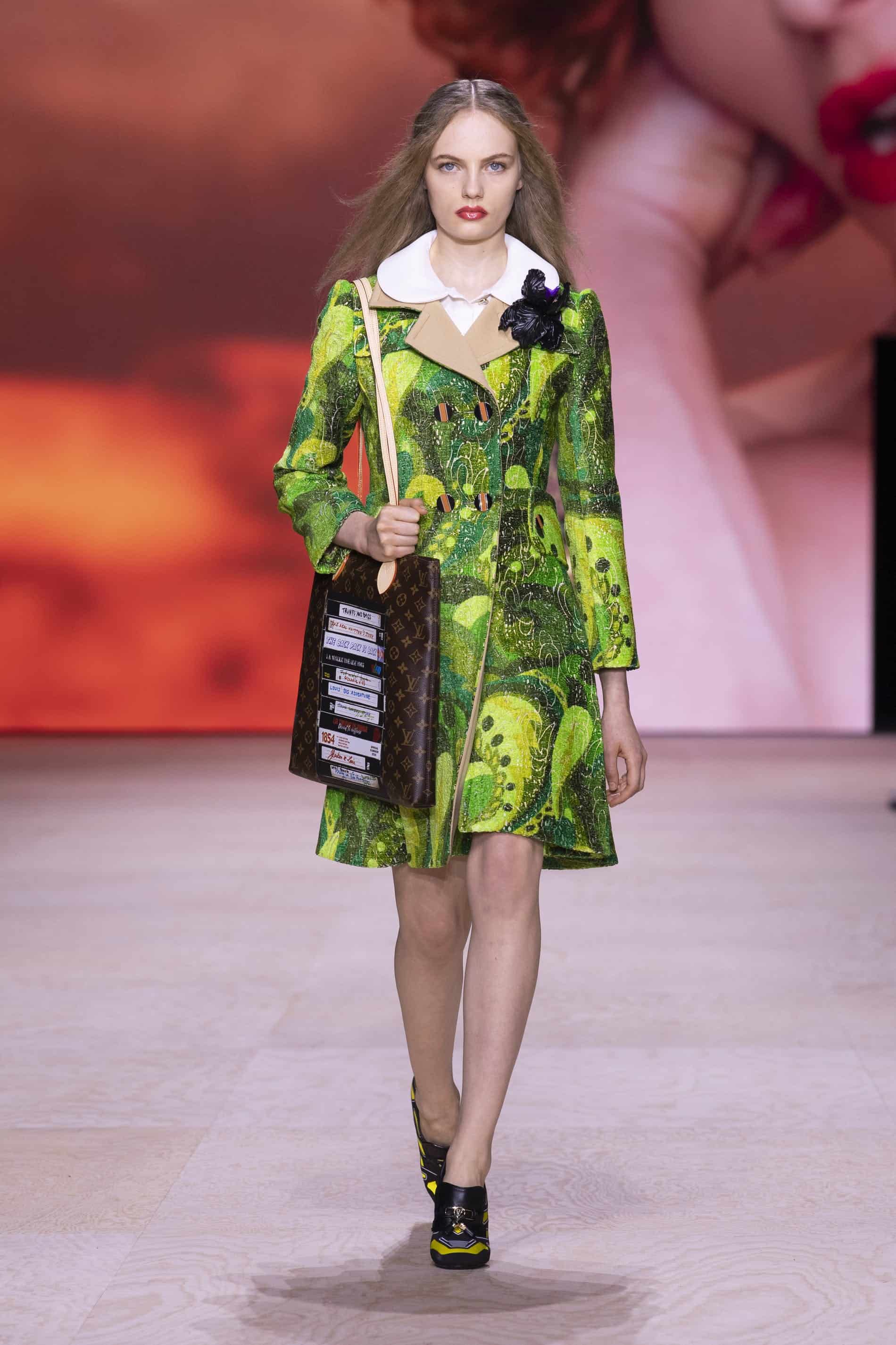 - معطف أخضر مزرّر فوق الركبة مطبوع بأشكال مرحة من عرض أزياء لوي فيتون لربيع/صيف 2020