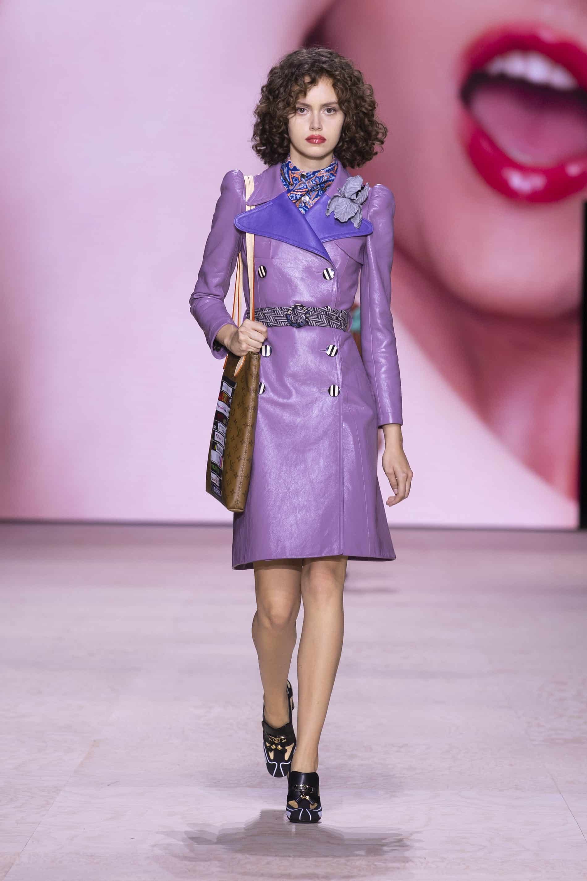 - معطف أرجواني متوسط الطول من الجلد بستة أزرار وبحزام أبيض وأسود مرتفع عن الخصر من عرض أزياء لوي فيتون لربيع/صيف 2020