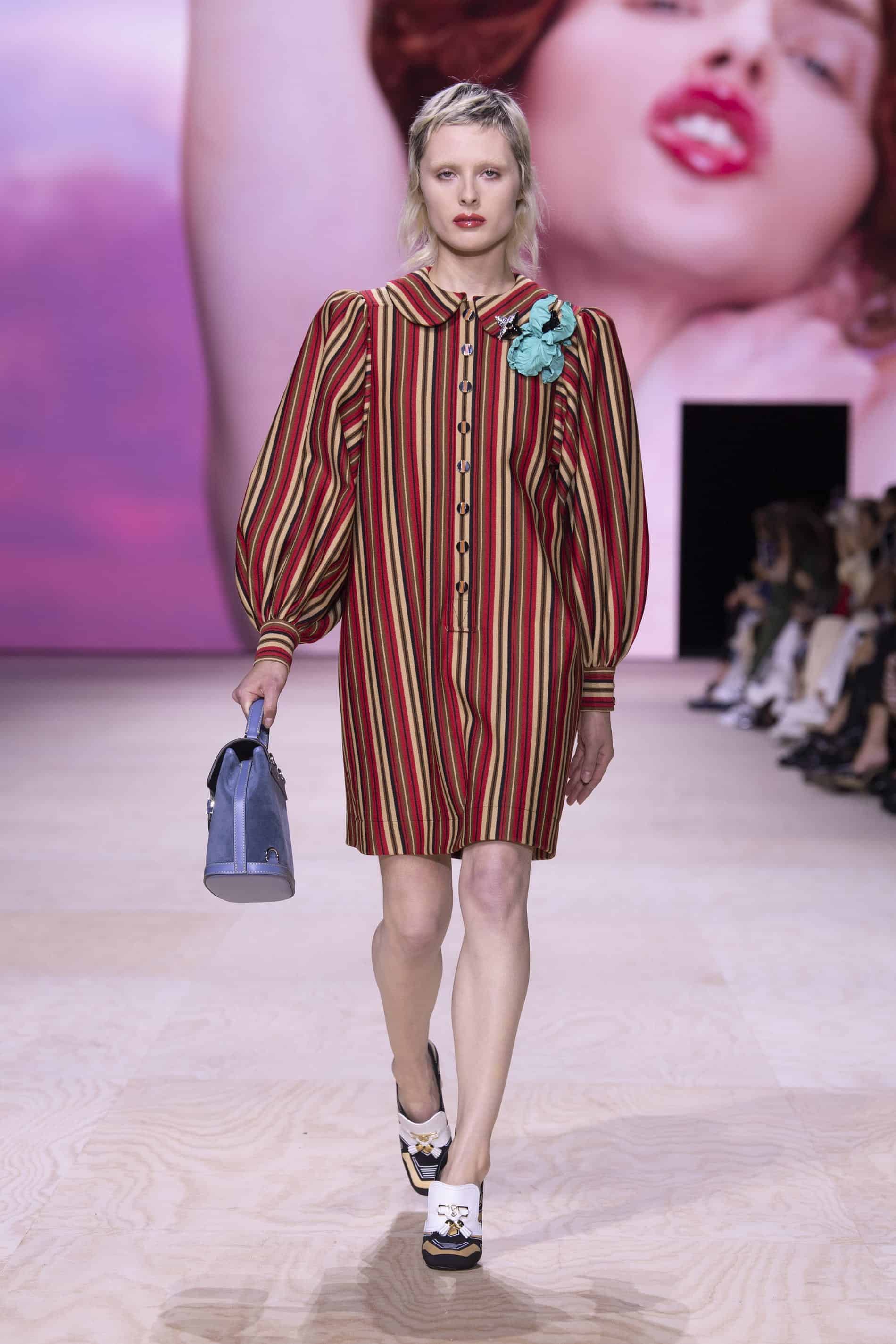 - فستان قصير مخطط بالطول بالأحمر والألوان الترابية بأكمام منفوشة وأزرار من عرض أزياء لوي فيتون لربيع/صيف 2020