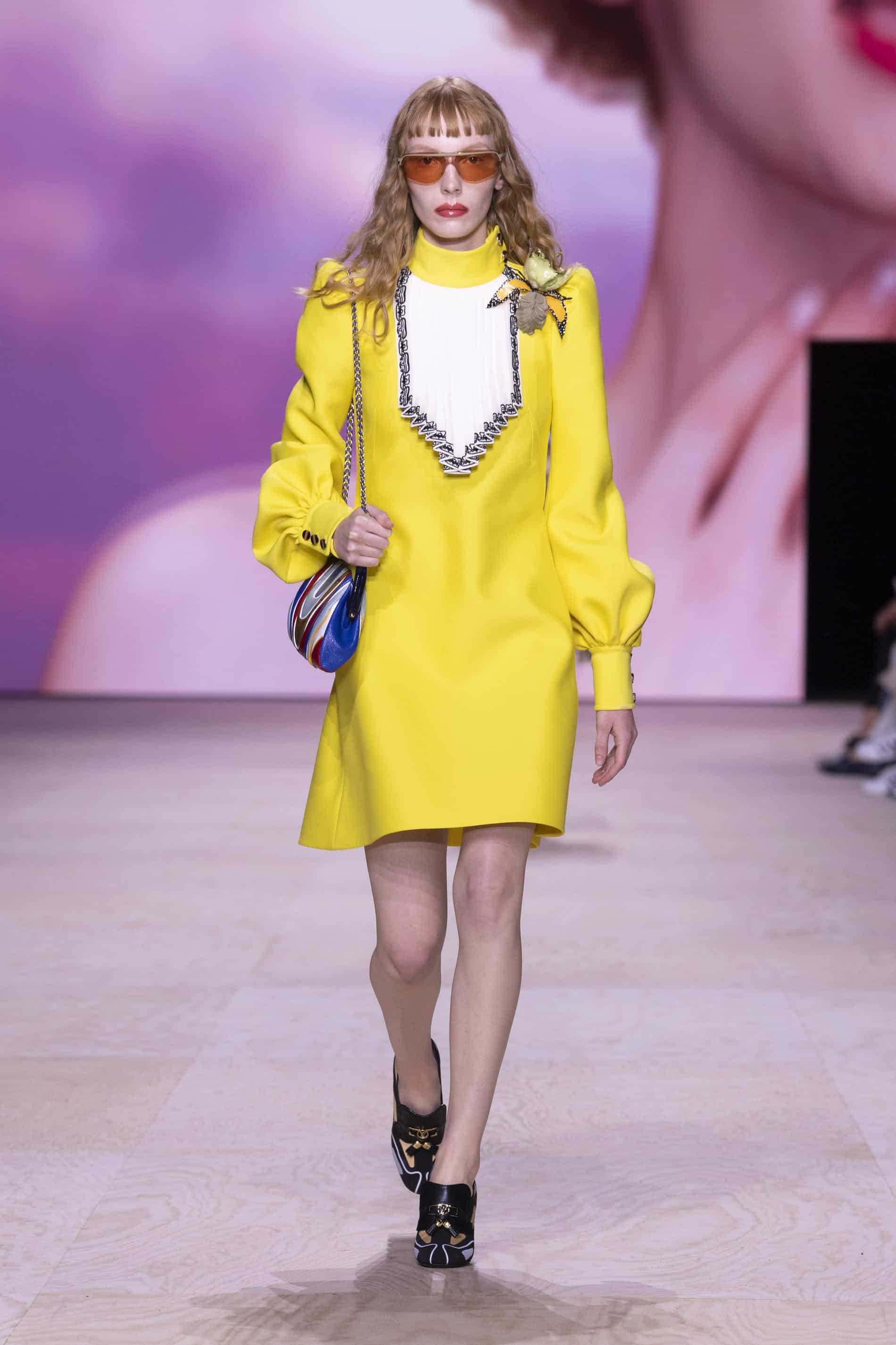 - فستان أصفر مع ياقة هندسية مبلّسة بيضاء وأكمام منفوشة من عرض أزياء لوي فيتون لربيع/صيف 2020