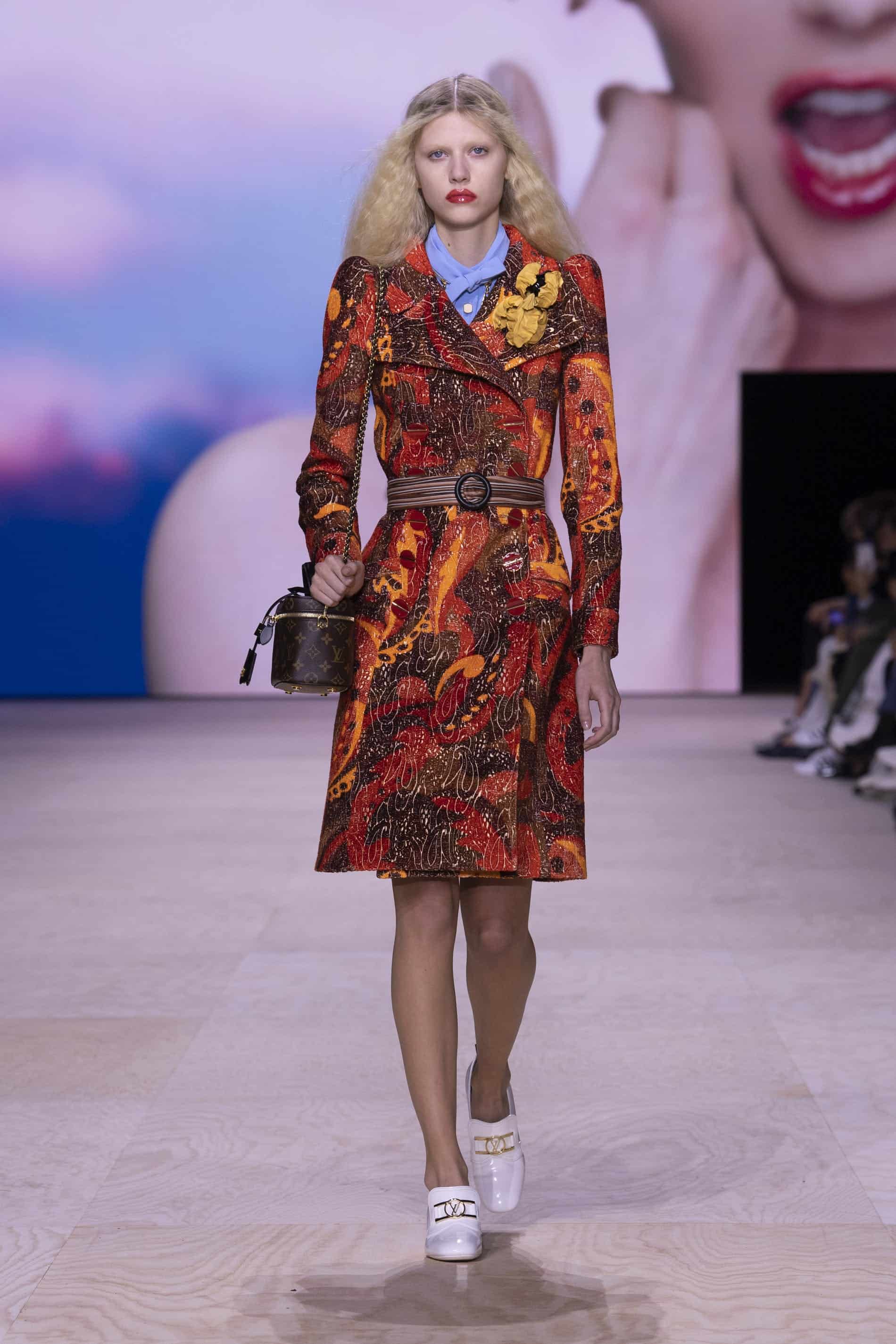 - معطف بمطبوعات جميلة ألوانها ناريّة مع حزام بخطوط عرضية بنية وباج من عرض الأزياء الخاص بـ لوي فيتون لربيع/صيف 2020