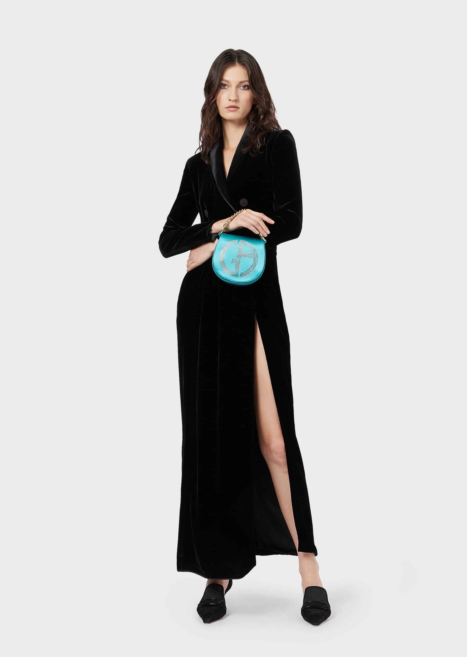 فستان جورجيو أرماني من المخمل الأسود مع شق جانبي