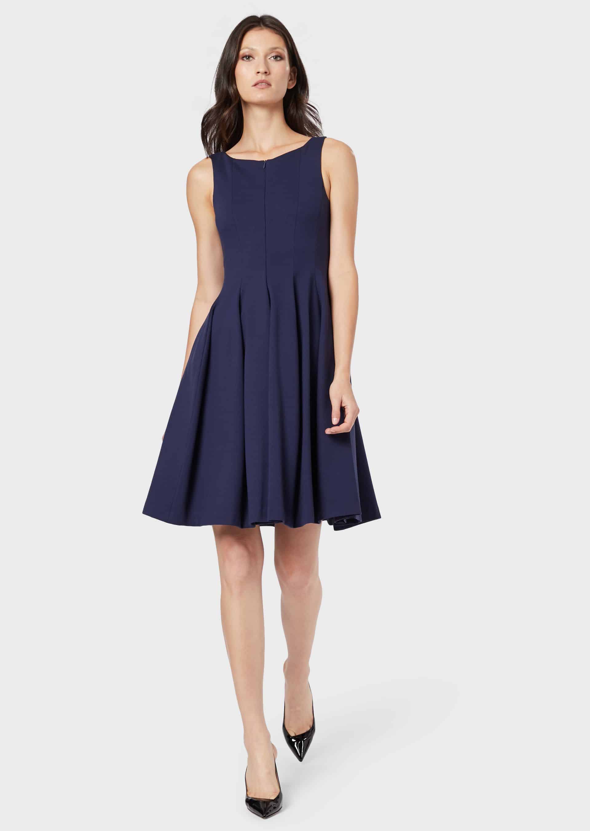 فستان جيرسي أزرق يتميز بتنورة ناعمة بطيات متعددة وسحّاب خفي في المقدمة.