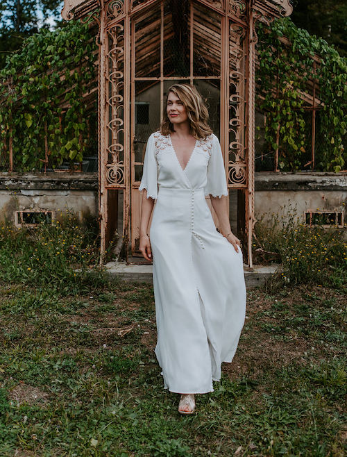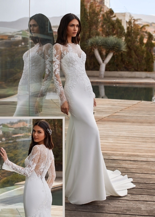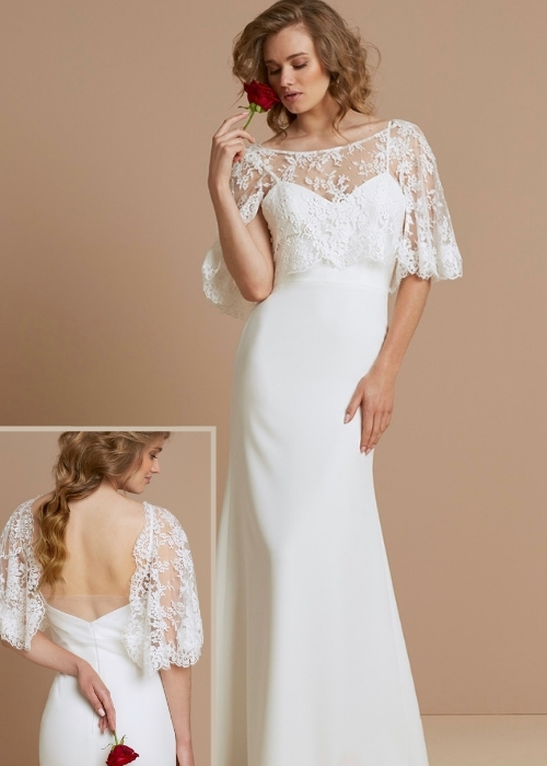 فستان زفاف منسدل بقصة ضيقة من الأسفل مع طبقة من الدانتيل عند الصدر والذراعين مع ظهر مكشوف.