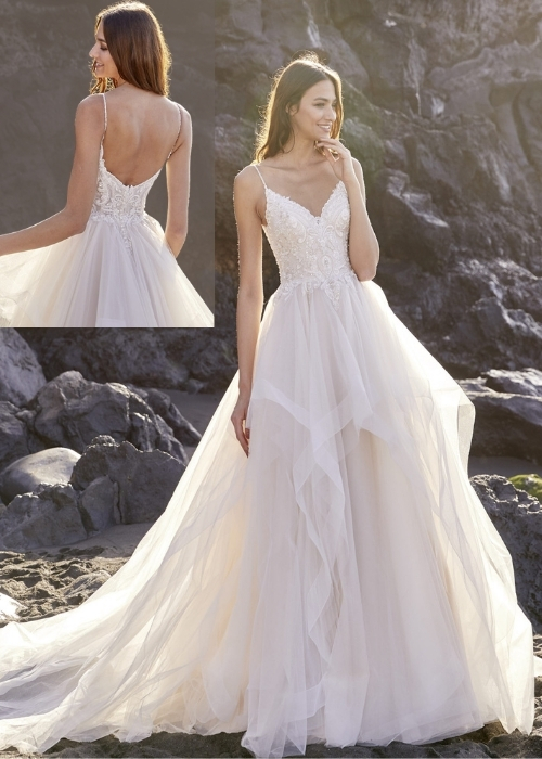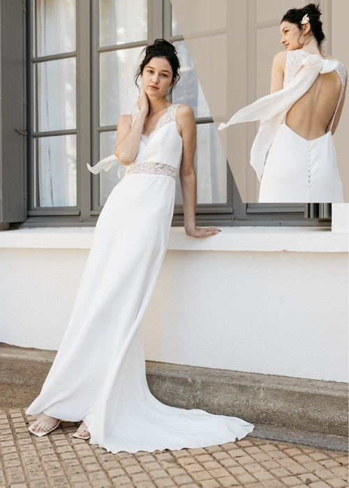 فستان زفاف بقصة مستقيمة مع حزام من الدانتيل عند الخصر وعند الكتفين وفيونكة مثبتة خلف العنق، الفستان يأتي بذيل طويل نسبيا من الخلف.